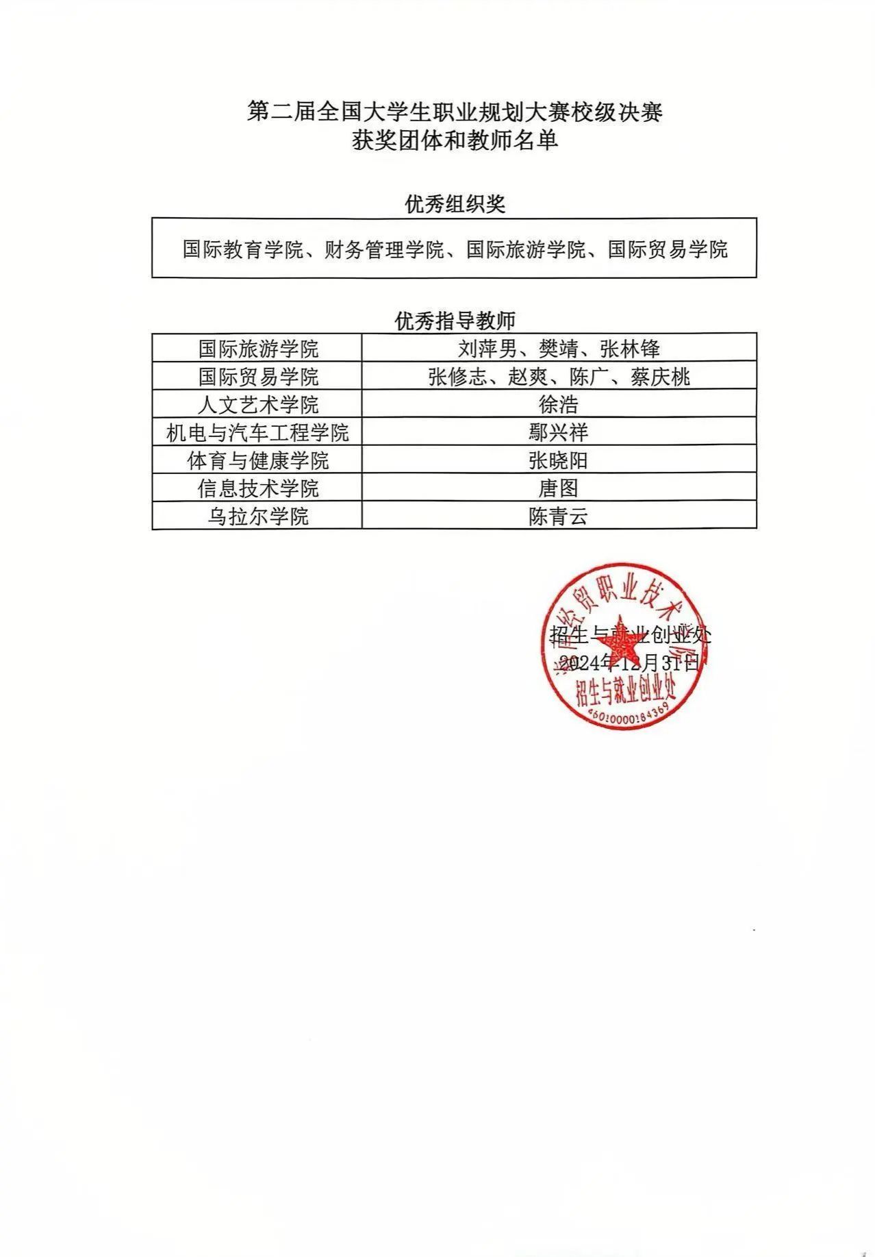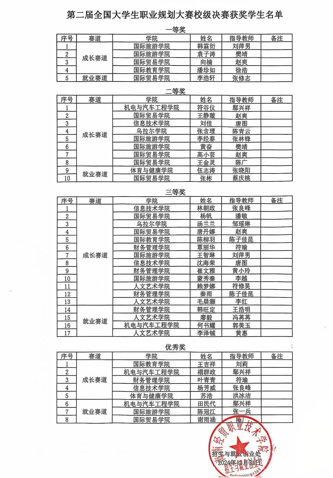 各二级学院: 经过报名、校赛网络评审和现场决赛等赛程,最终评选出成长赛道和就业赛道的一等奖、二等奖、三等奖、优秀奖以及优秀组织奖、优秀指导教师等名单。 现将获奖情况进行公布(详见附件),请各学院传达到获奖学生和教师,祝贺!