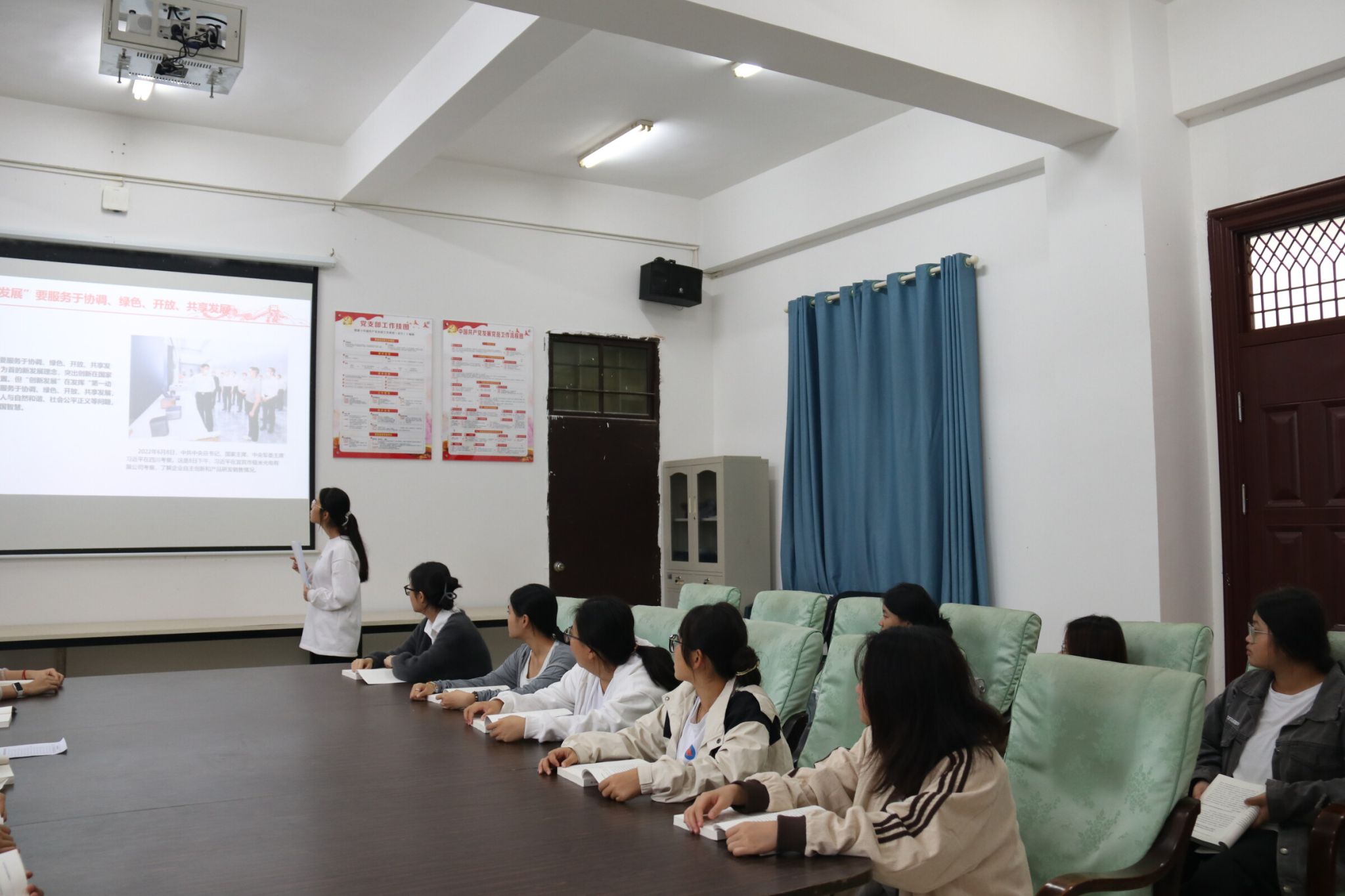 活动开始,同学们认真研读了《深入学习习近平关于科技创新的重要论述》。随后,王秋菊同学结合前期的学习内容,带领大家深入探讨了科技创新的重要性,使同学们对“创新发展”服务于协调、绿色、开放、共享发展的理念有了更为深刻的认识。她着重指出,“创新发展”在发挥经济增长“第一动力”作用的同时,还需致力于解决发展不平衡、人与自然和谐共生、社会公平正义等关键问题,以向世界发展贡献中国智慧。