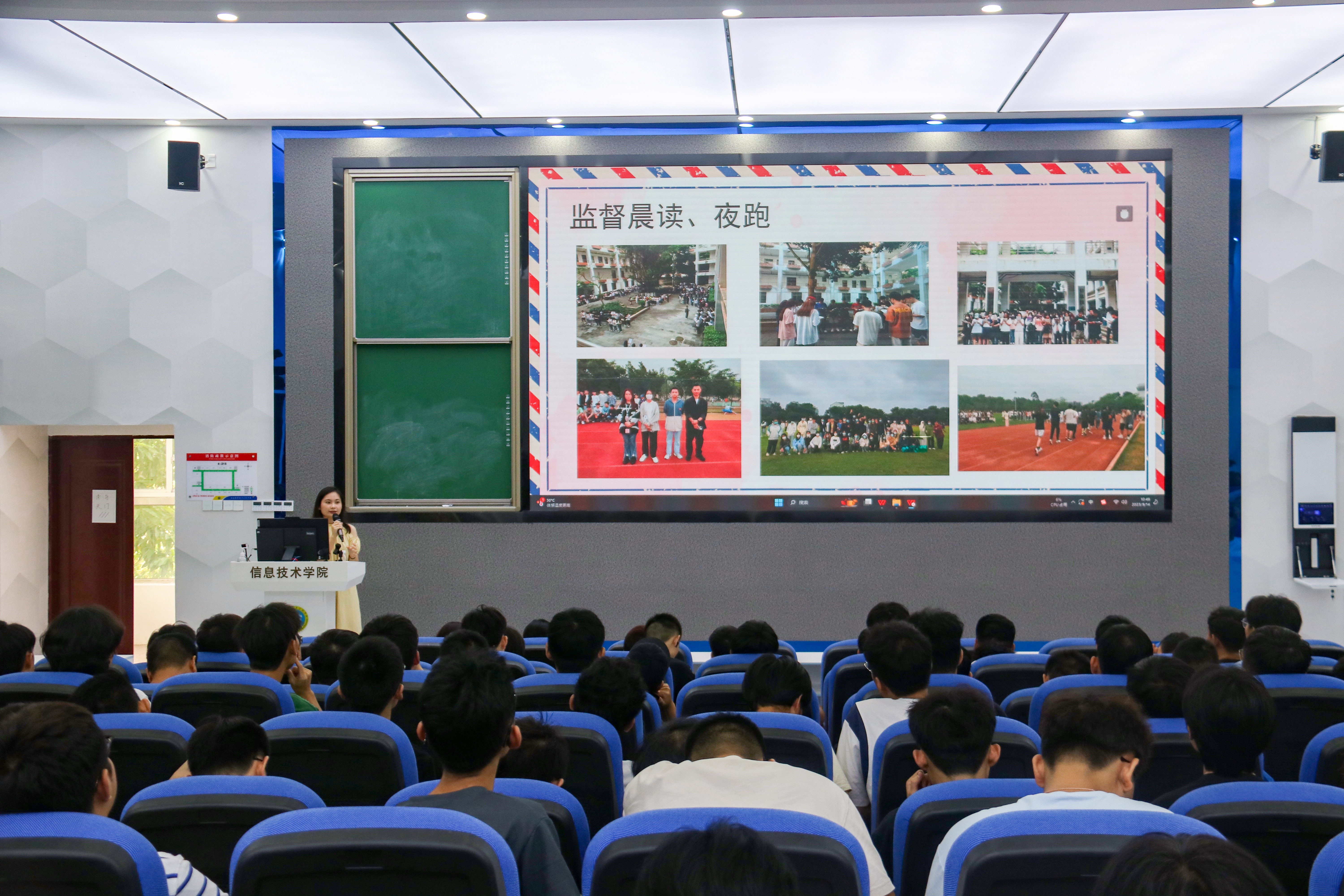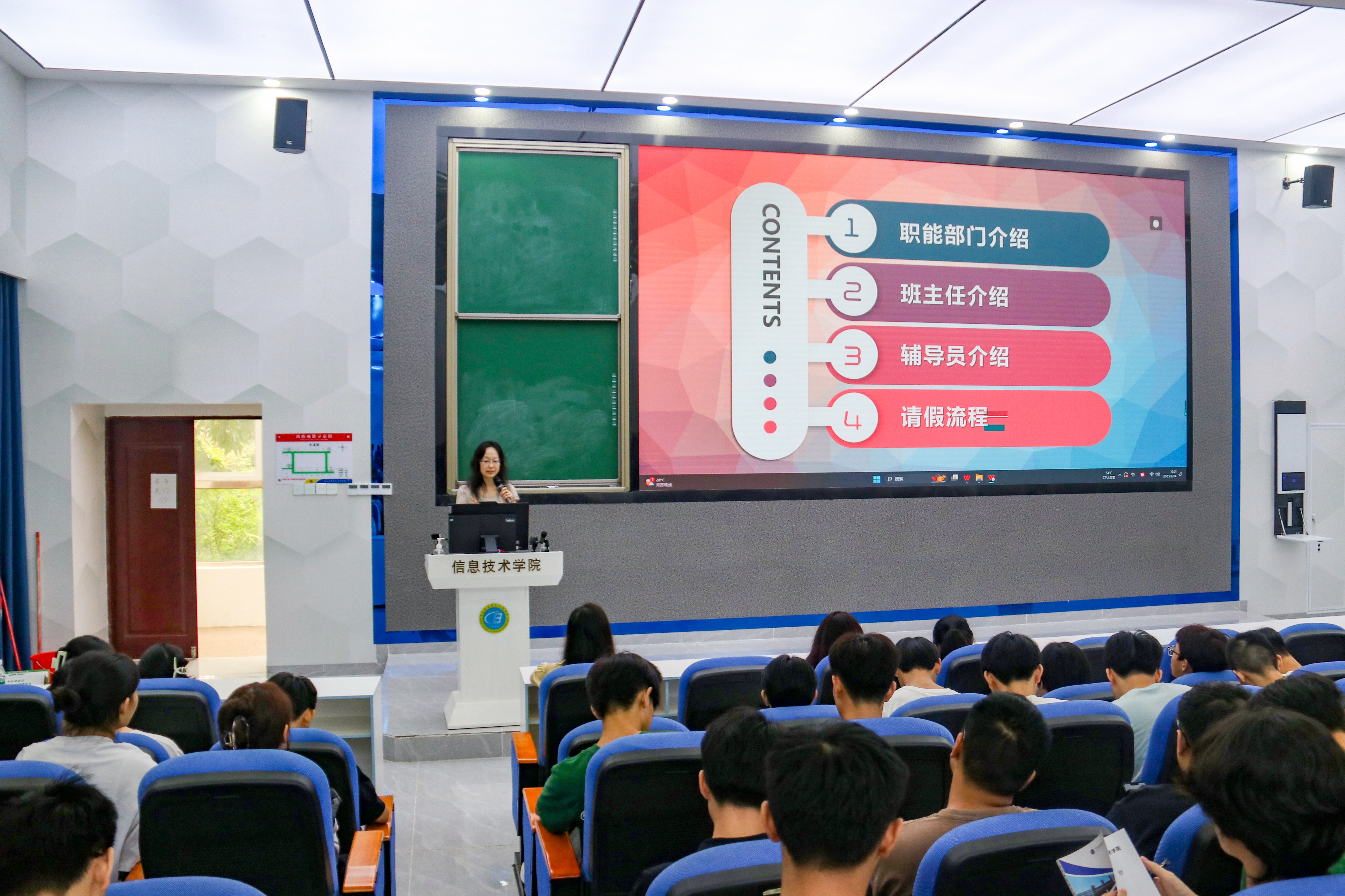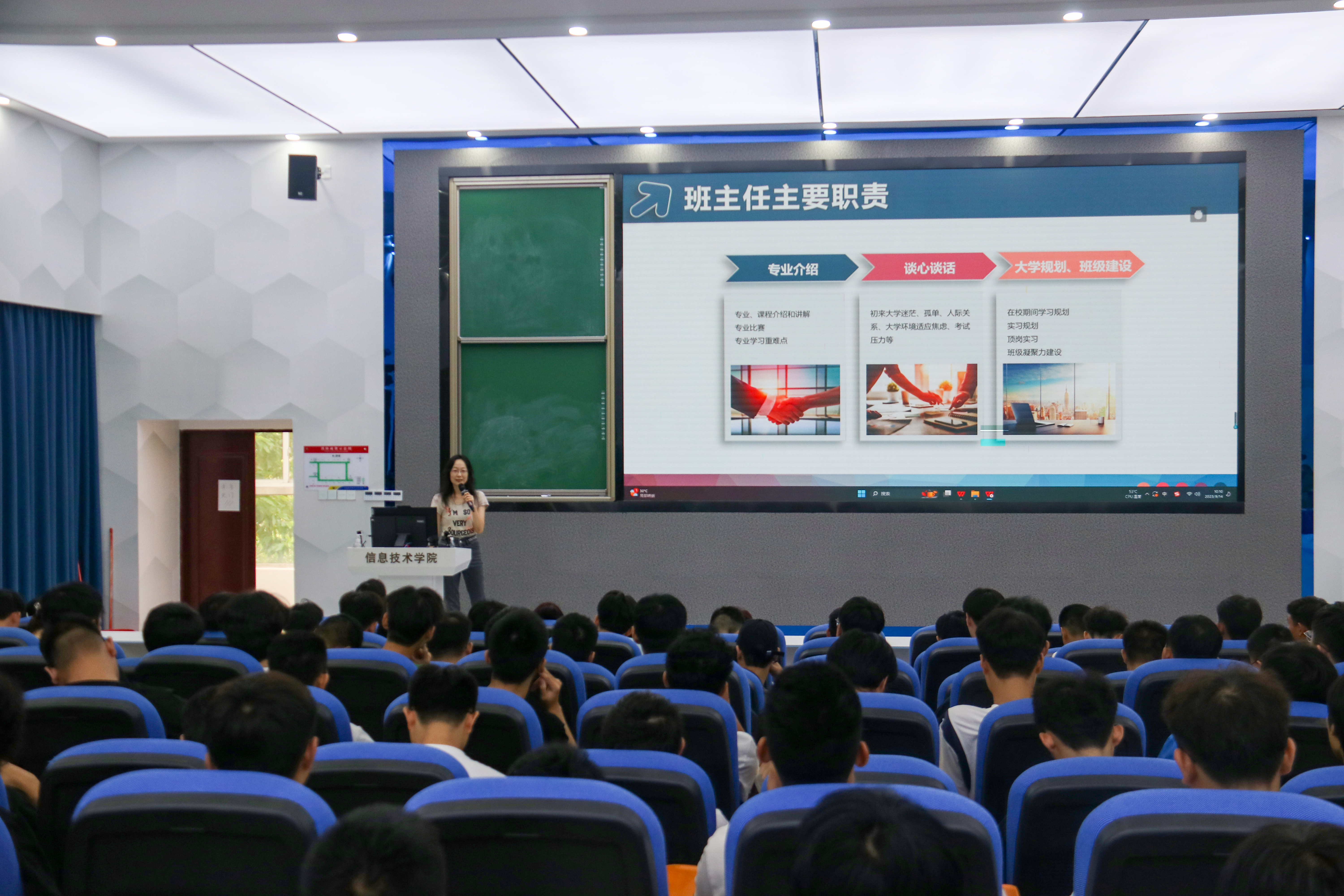 会议伊始,代老师从职能部门介绍、班主任介绍、辅导员介绍、请假流程、军训要求、班委竞选、综合素质测评、入党流程介绍八个方面依次进行讲解,鼓励大家要严格要求自己,提高政治意识,端正入党动机,积极向党组织靠拢。