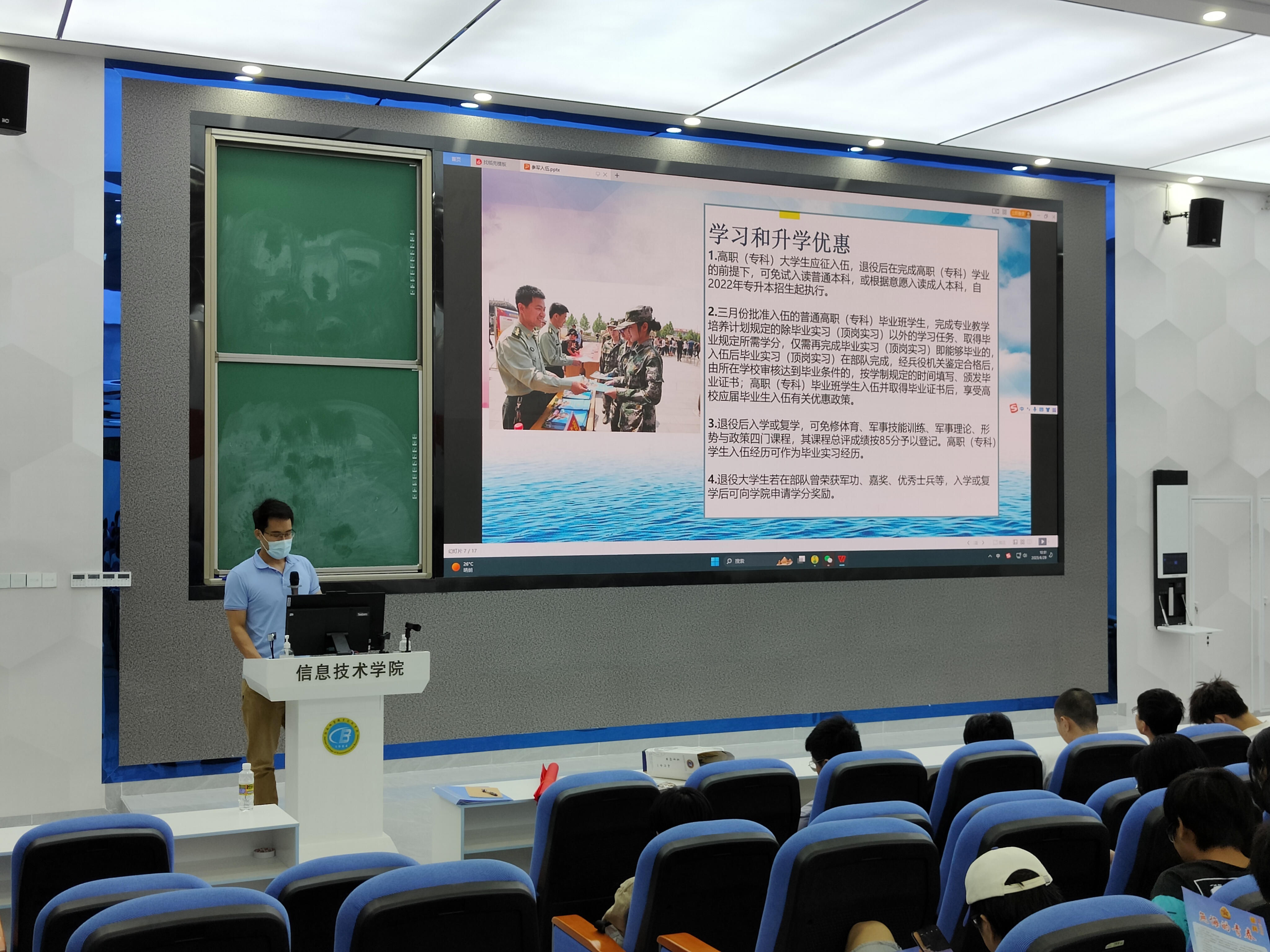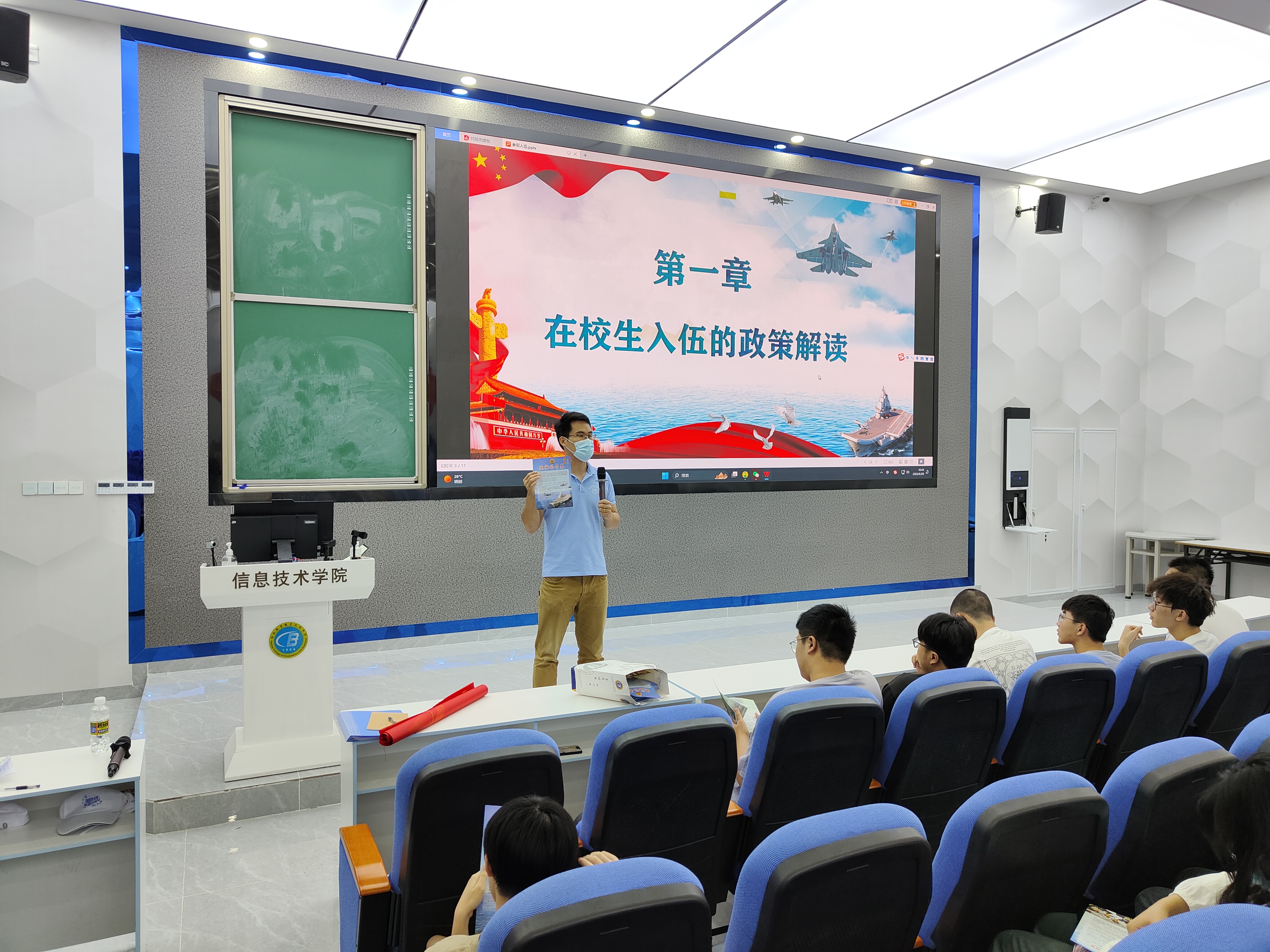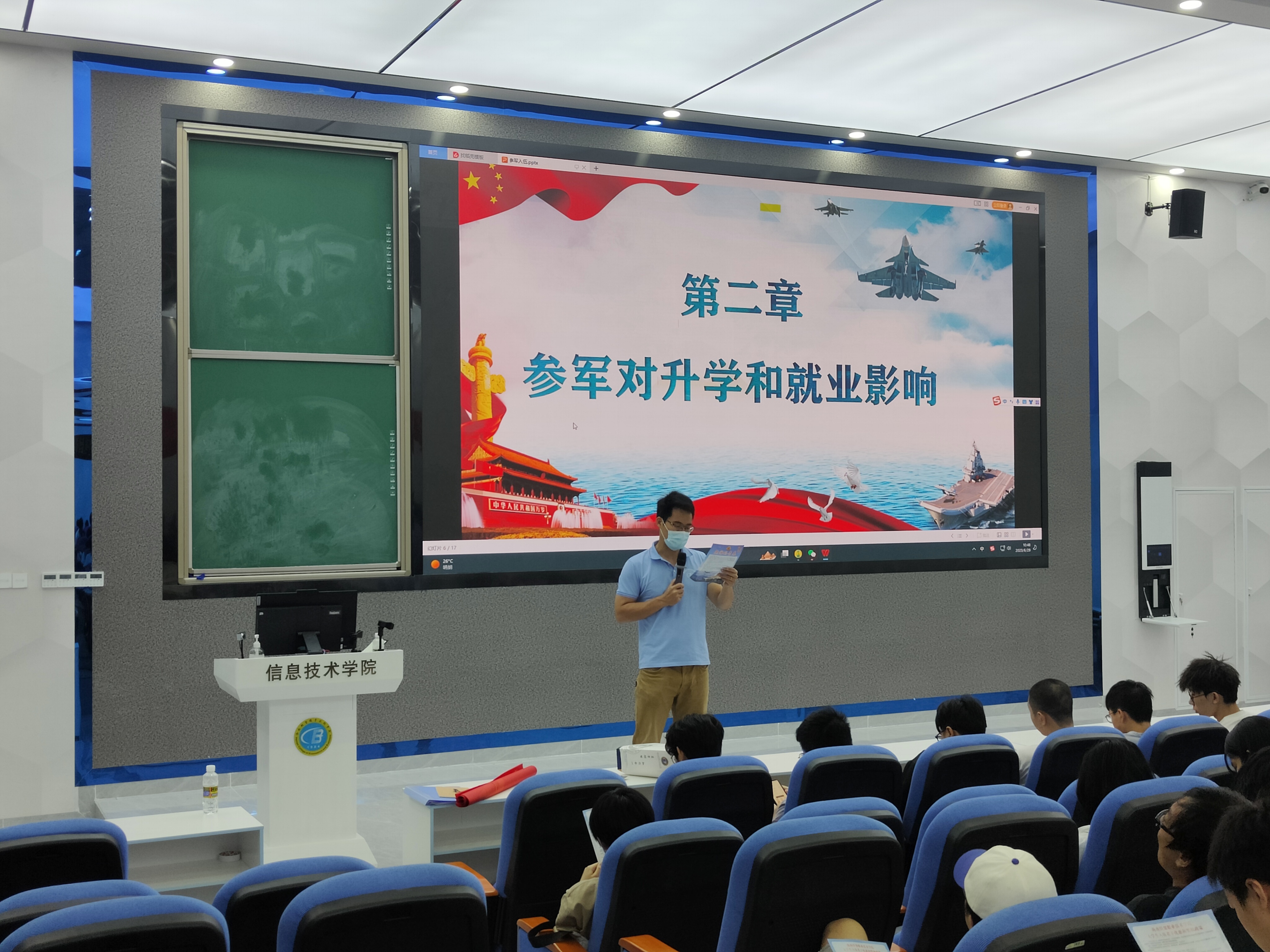 宣讲伊始,唐图老师给同学们观看2023年征兵宣传片,让信息学子热切感受到人民子弟兵对祖国的热爱、对社会的责任、对人民的守护。紧接着,唐图老师向全体同学详细解读了在校生入伍的优惠政策,大学生参军入伍不仅可以积攒一份与众不同的人生阅历,锤炼一种军人钢铁般的意志,还能积累到一份无形的精神财富,享受到政府赋予的各种优惠福利政策。