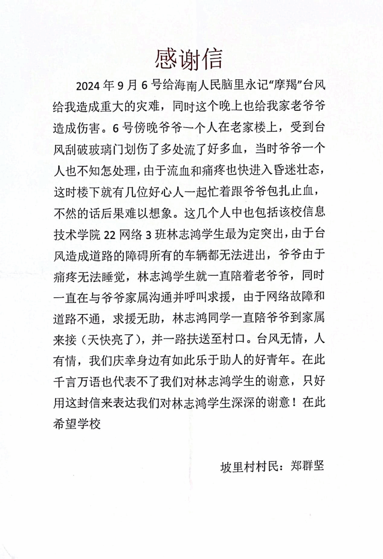 2024年9月6日晚,坡里村的一位爷爷在家中不幸被台风刮破的玻璃门划伤,流血不止,情况危急。面对这一突发状况,林志鸿没有丝毫犹豫,立即与几位好心人一同为爷爷进行紧急包扎止血。由于台风导致道路受阻,信号中断,车辆无法通行,求救变得异常困难。但林志鸿并未放弃,他坚持与爷爷家属保持沟通,并尝试各种方式呼叫求援。在等待救援的漫长过程中,林志鸿一直陪伴在爷爷身边,给予他安慰和鼓励,用自己的行动诠释了青春的担当和勇气。