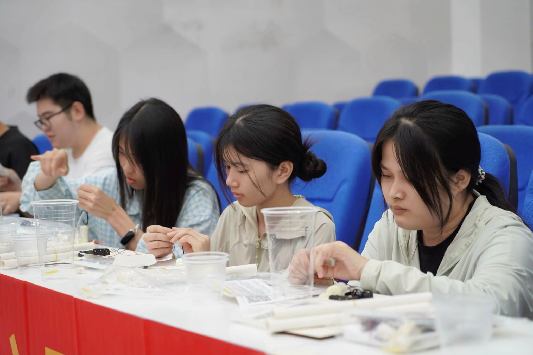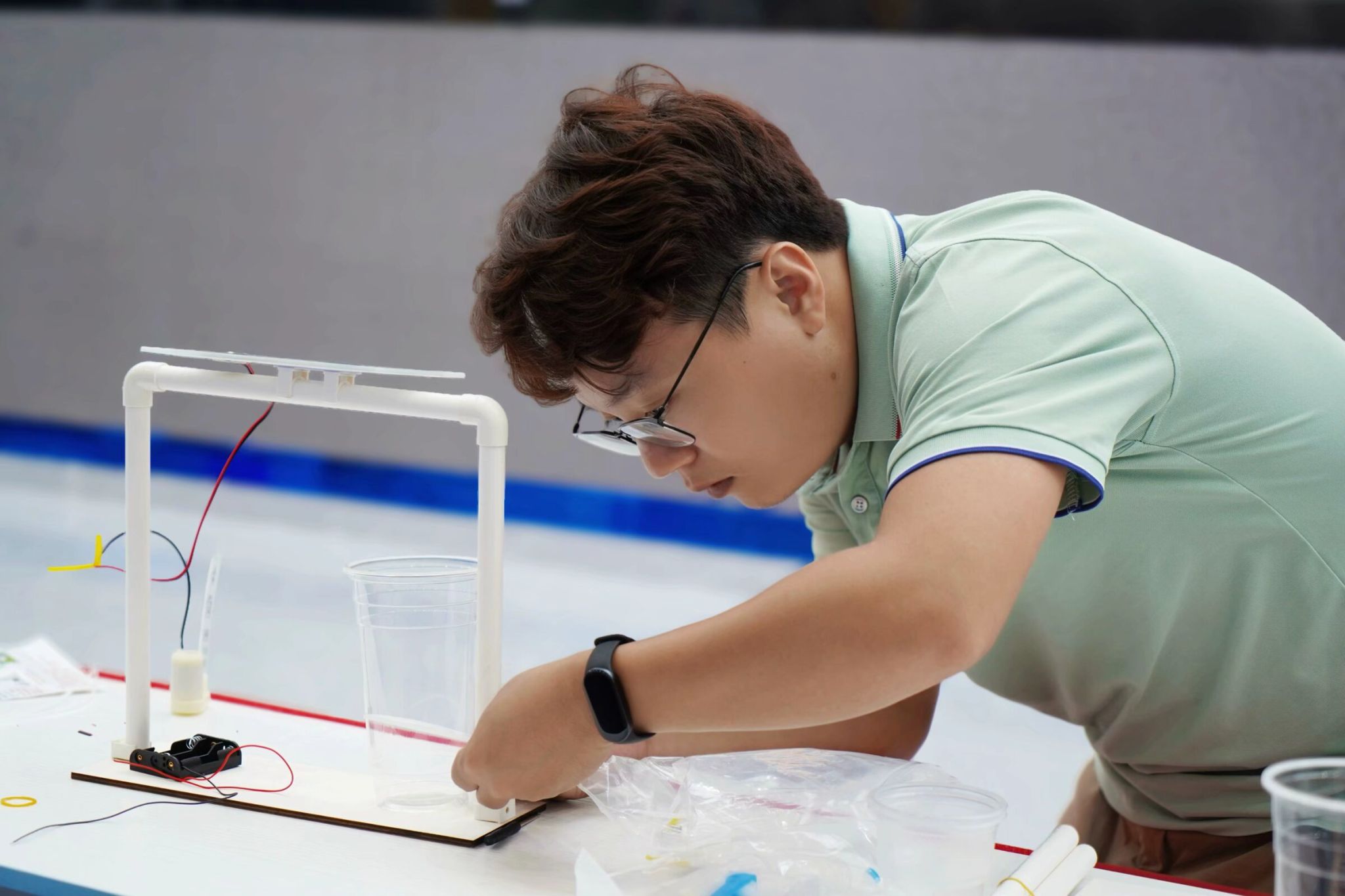 活动中,符传栋老师亲自上阵,以其娴熟的技巧率先完成了太阳能浇花模型的组装,为参与者树立了良好的榜样。活动巧妙融入了心理团辅元素,以手工制作为载体,让参与者在动手实践中探索心灵世界。大家热情参与,有的精心连接部件,有的细心固定管卡,彼此间交流协作,共同克服困难,如水管连接不稳、电路调试等,展现了非凡的探索精神与创新意识。