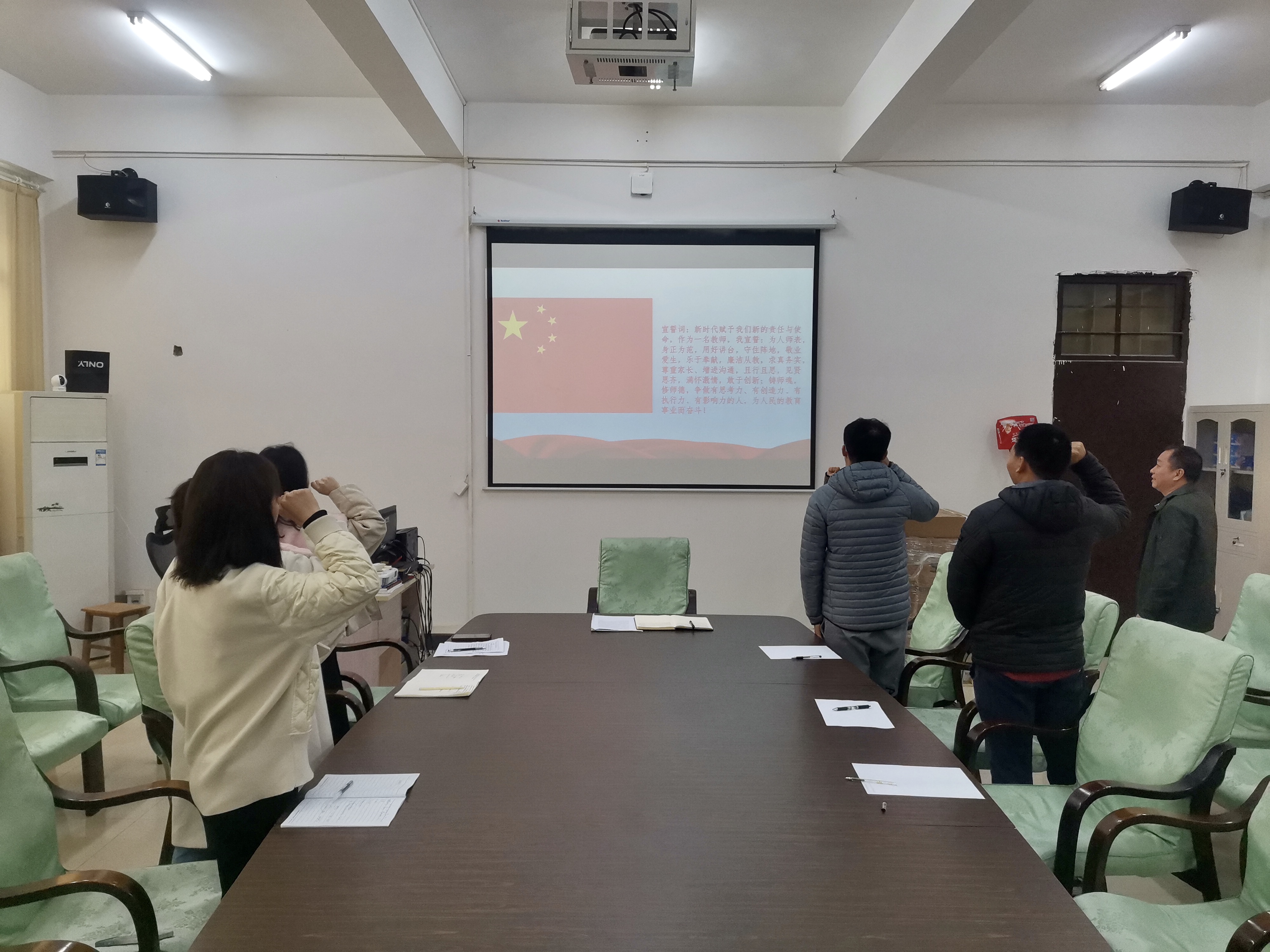 会议第一项,由孙金带领大家学习了《新时代高校教师职业行为十项准则》,并以案为鉴,学习了近年来发生在高校违反教师职业行为十项准则的典型案例,分析了少数教师出现师德失范行为的原因。并表示,要加强师德师风和作风建设,自觉坚守精神家园,认真履行岗位职责。会议第二项,全体新教师高举右拳,面向国旗庄严宣誓,表明了作为新时代教师坚定的决心和态度。