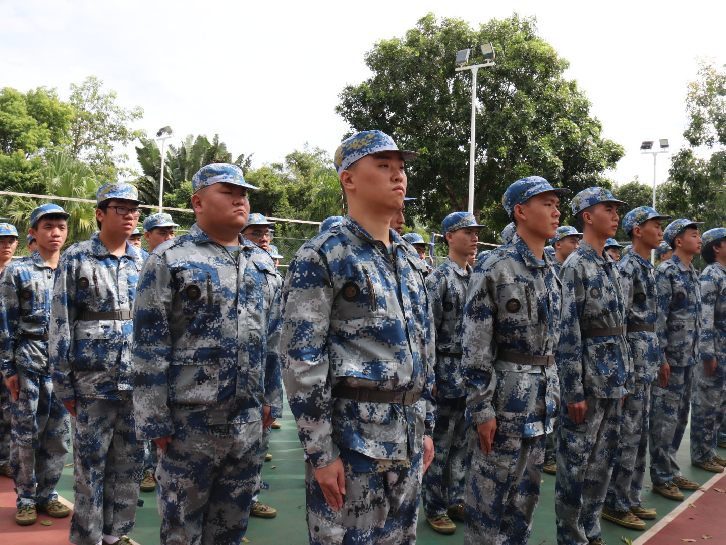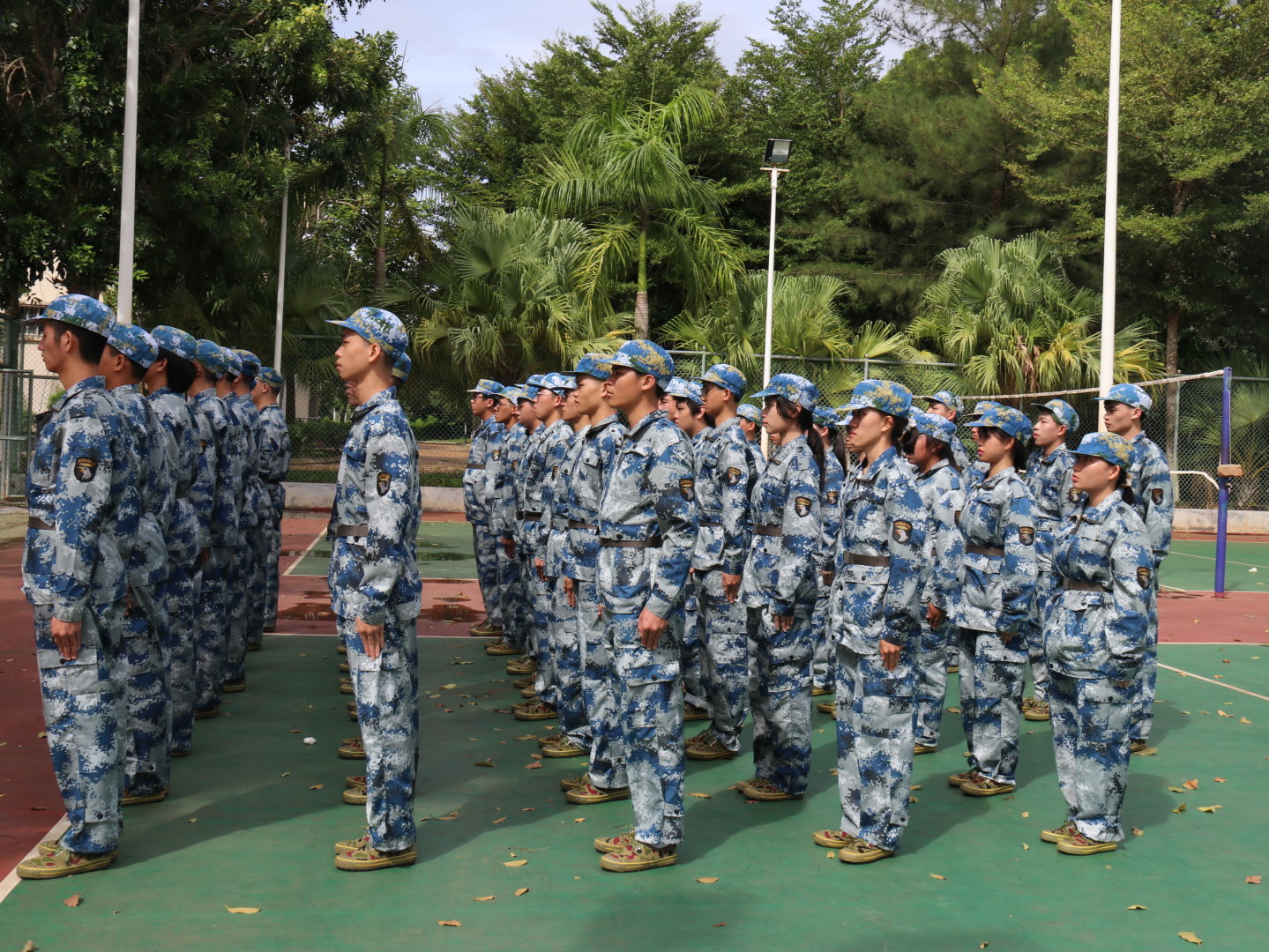今天主要训练内容是队列练习:立正、稍息、停止间转法、齐步、正步、跑步、立定等。在教官的悉心教导下,同学们一遍又一遍的加紧练习,逐渐将动作操作熟练,训练成效也越加明显。