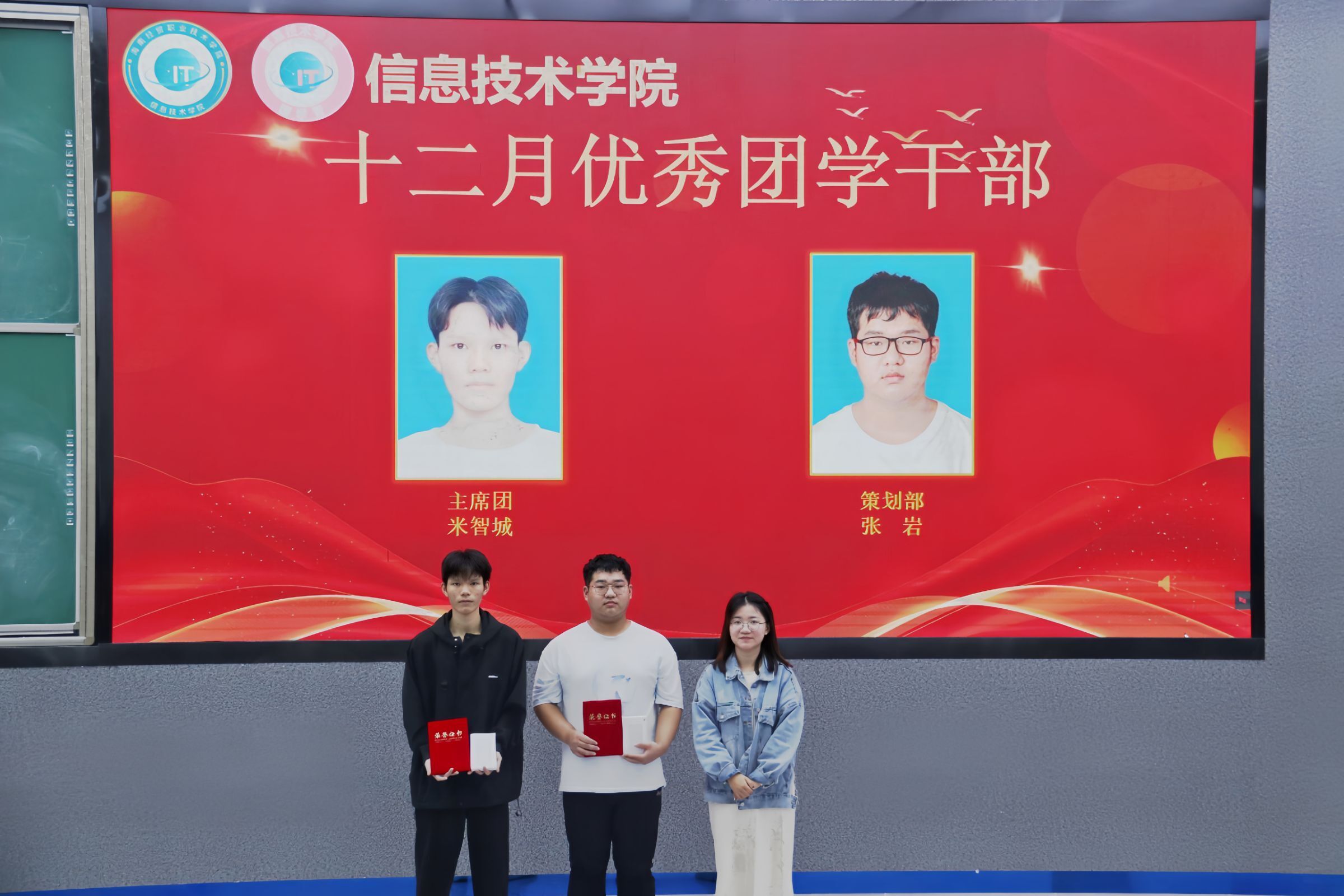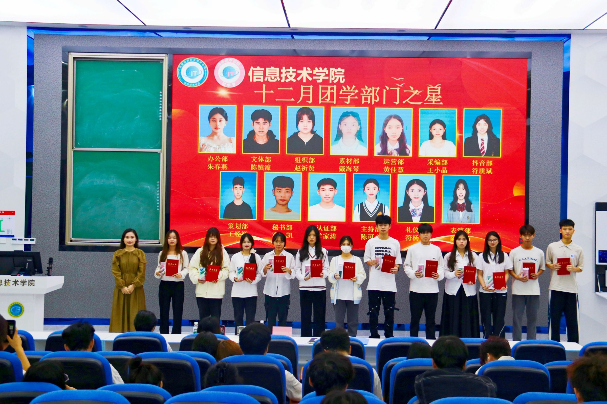 随后,蔡守正老师宣读12月优秀团学干部及部门之星的表彰决定,由吴淑亲老师为“优秀团学干部”米智城、张岩进行颁奖;蔡守正老师为“部门之星”朱春燕、王小晶、陈可心、赵祈贤、符质斌、符杨平、陈镇濠、王经裕、陈杨、戴海琴、羊家涛、黄佳慧、邓凯进行颁奖并合影留念。