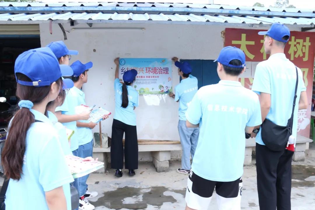 第一站,在水头村委会办公点,孙书记详细向我们介绍了水头村帮扶队伍建设、产业帮扶、危房改造、医疗帮扶、教育帮扶、就业帮扶等具体情况,紧接着在学院孙金书记的带领下,全体志愿服务队员通过实地走访村民,向当地村民群众发放乡村振兴环境卫生整治的宣传册并现场解读乡村振兴人居环境的相关知识,随后在村中的小商店外墙和垃圾屋墙壁上张贴设计并印刷好的宣传海报,进一步将乡村振兴人居环境卫生整治的观念深入当地村民心中,从而做到全员参与人居环境卫生整治,共同携手创建和谐文明乡村。