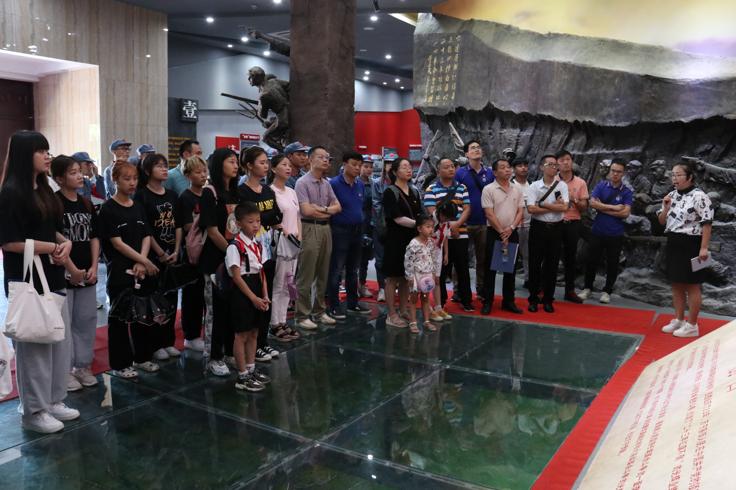 接着,我们走进纪念园,参观馆内存放着那段硝烟弥漫的革命岁月保留下的那一份份弥足珍贵的资料文献、一件件承载红色故事的革命遗物、一尊尊逼真的先烈人物雕像,心中百感交集。通过讲解员的生动讲述,详细了解到六连岭革命根据地“二十三年红旗不倒”的光辉革命历史,深刻感悟到先烈们舍生忘死、艰苦奋斗的红色革命历程。