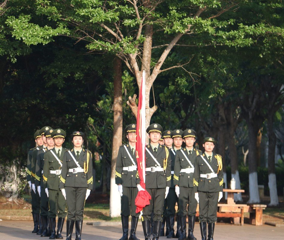 第一项:出旗,升国旗,奏唱国歌,全体肃立,行注目礼。国旗队身穿戎装,精神抖擞的走来,昂首挺胸,步伐整齐划一。