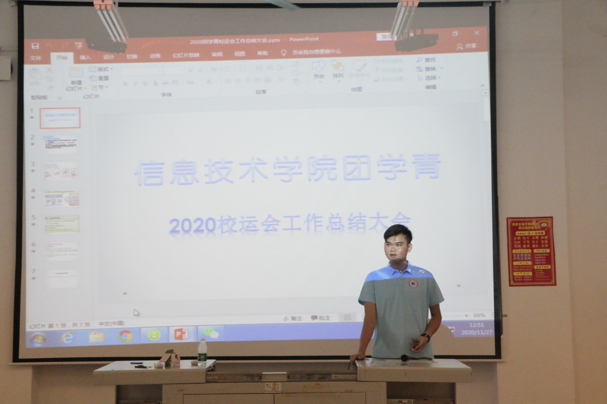 2020年11月27日星期五(青年媒体中心刘开平 报道)讯,在11月27号中午12点30分我院团学青在2-408室举行了2020校运会工作总结大会,出席人员有辅导员唐图老师、团学青各干部及全体干事。本次会议由团学青主席黄文主持。
