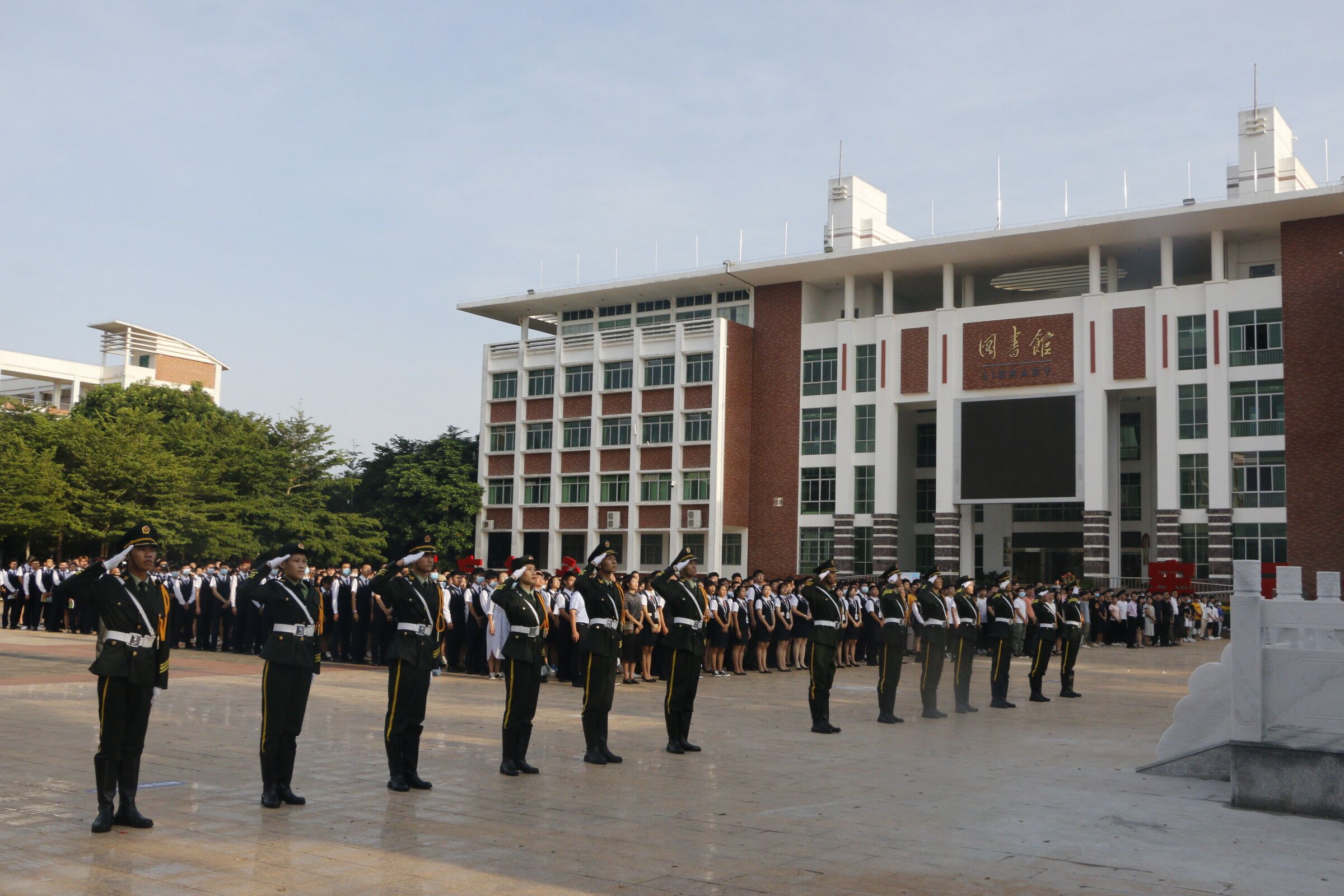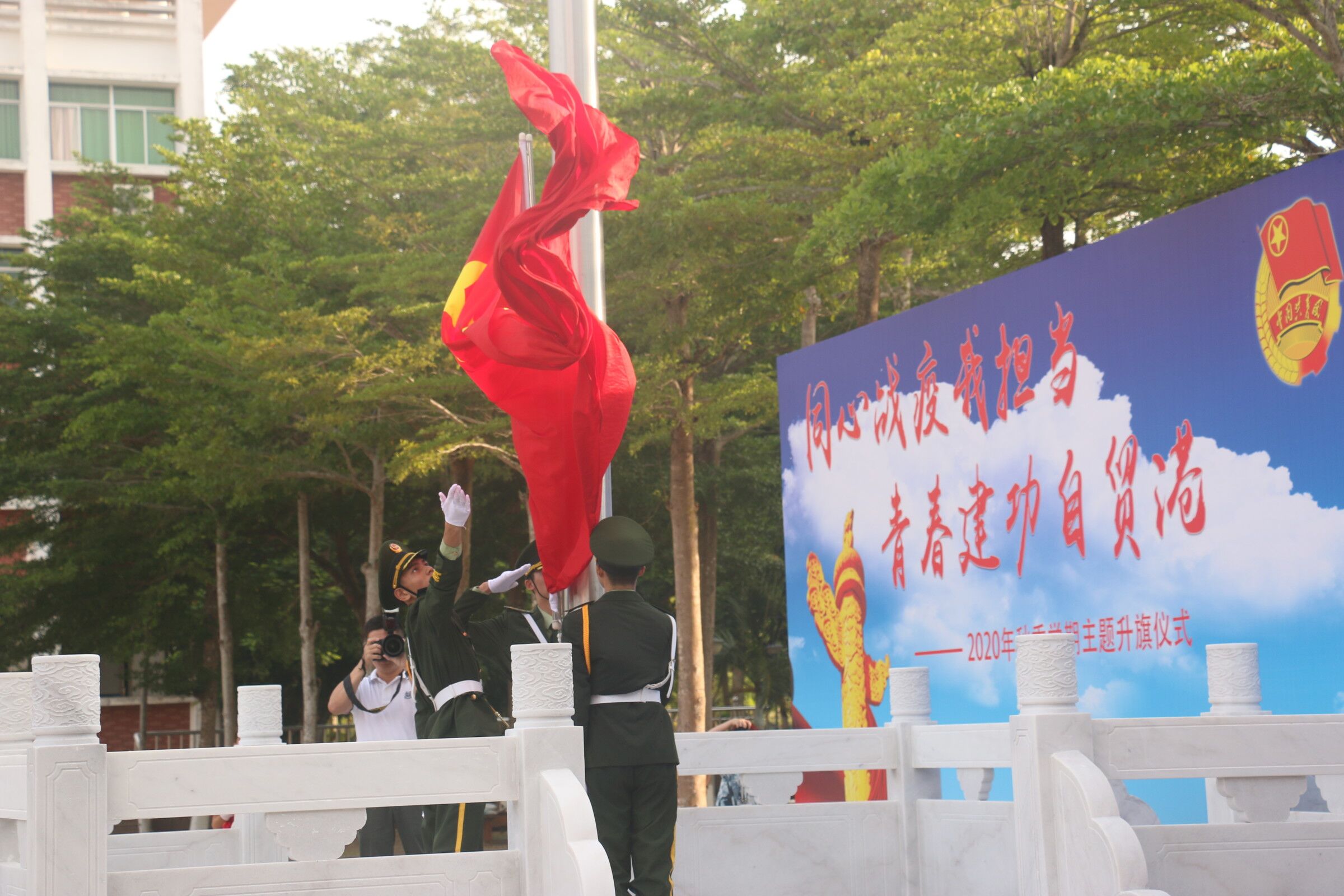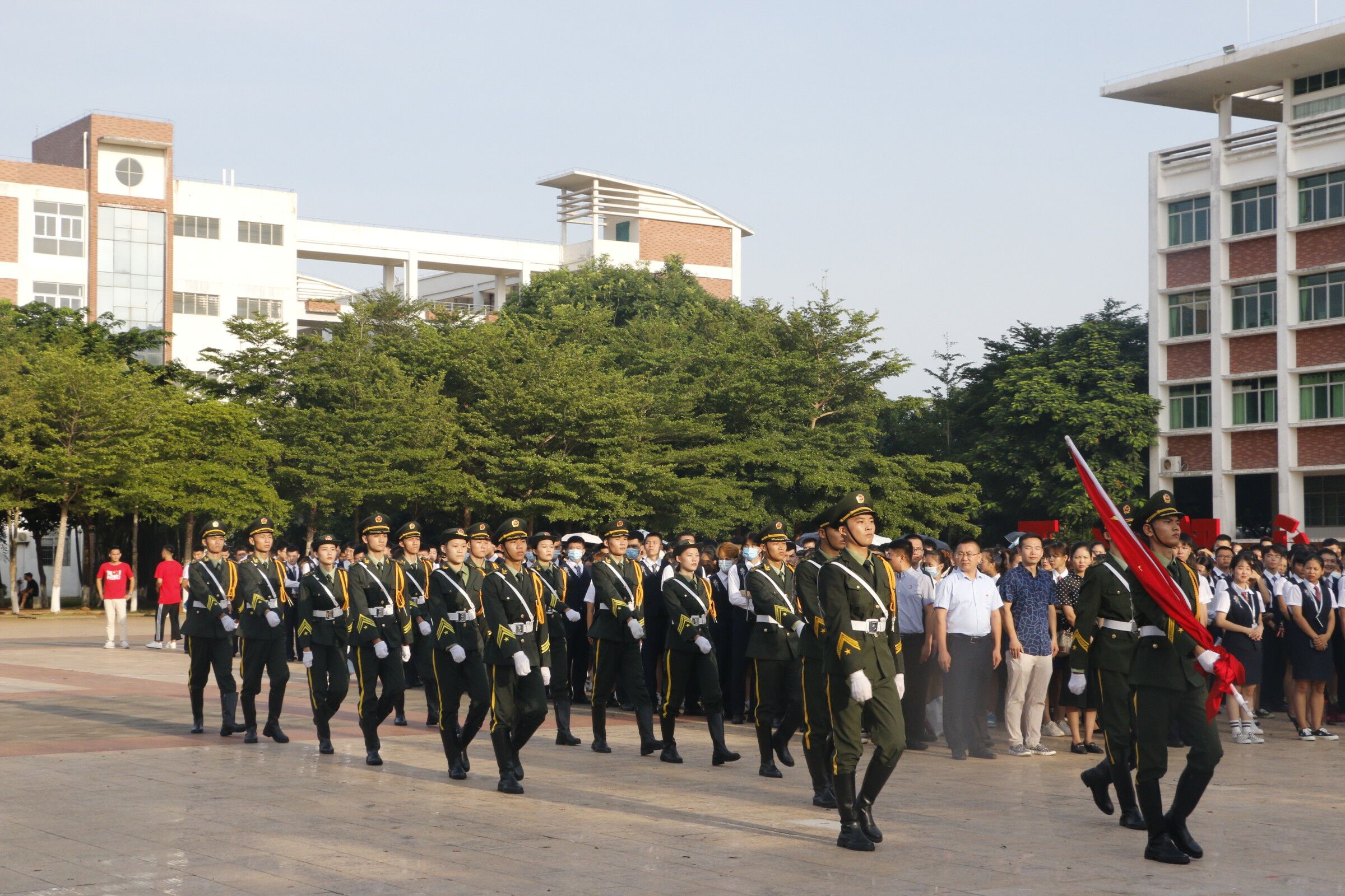 2020年9月7日(院青年媒体中心 李名总报道)讯,我校于9月7日早晨7:45在经贸广场举行“同心战疫我担当,青春建功自贸港”主题升旗仪式。出席本次升旗仪式有二级院校书记、副书记,全体辅导员,全体在校生。