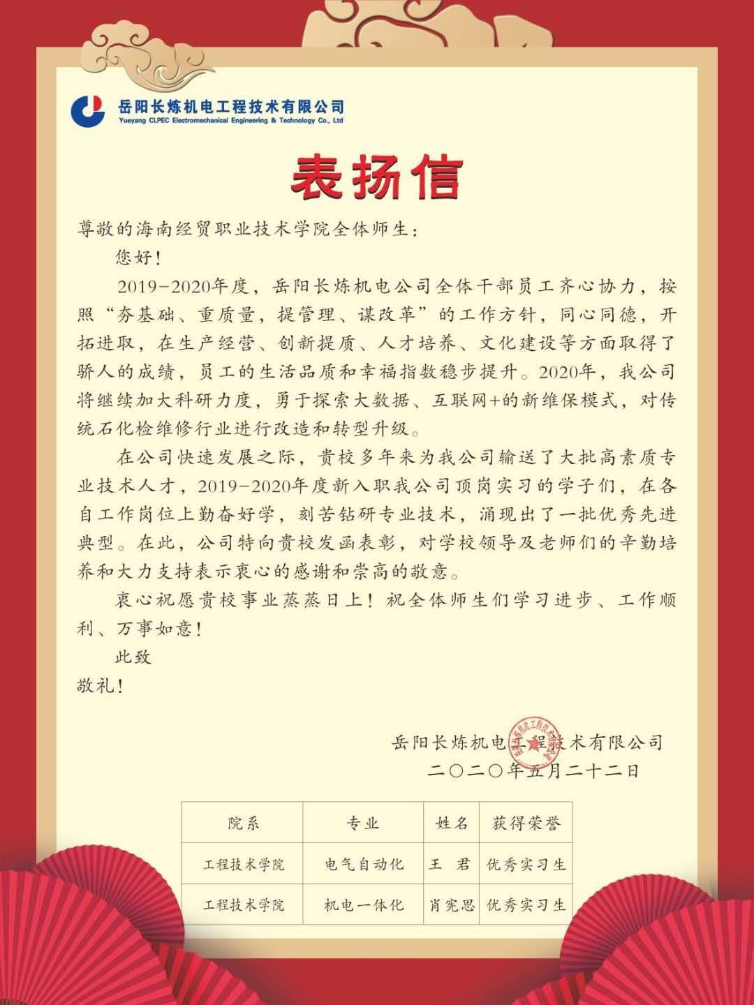 近日,工程技术学院2017级机电一体化专业的肖宪思,电气自动化专业的王君获得了岳阳长炼机电工程技术有限公司颁发的“优秀实习生”称号。