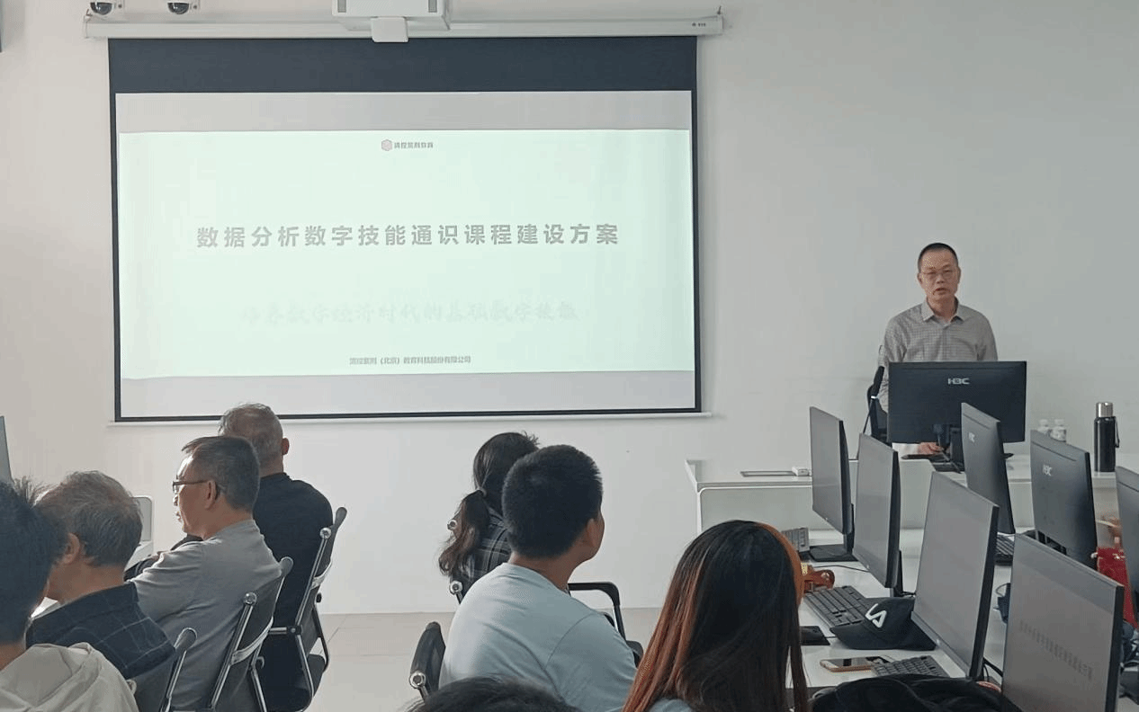 本次培训邀请了来自清控紫荆(北京)教育科技股份有限公司的专家进行授课与交流。专家围绕数据分析的基本概念、方法与技术,数字技能在教育教学中的应用,以及数字化教材建设的理念与实践等方面进行了深入浅出的讲解。参训教师就如何更好地将数据分析与数字技能融入通识课程,如何推进数字化教材的创新与发展等问题进行了热烈的讨论与交流。