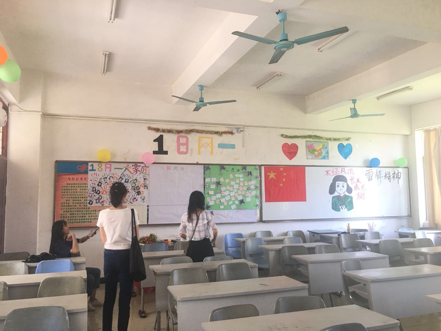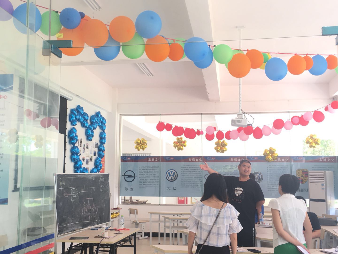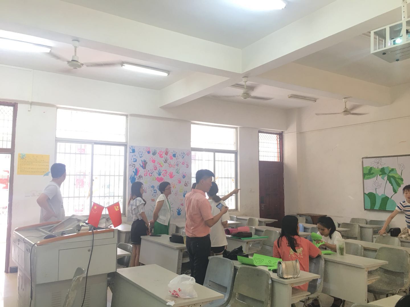 参与本次考察工作的老师进入班级后,班级的负责人带领老师参观了整体班级建设,针对本班的文化及规划做了详细的介绍。五颜六色的彩笔、各式各样的气球、有趣的涂鸦、板报的丰富内容,经过同学们的共同努力,使宽敞明亮的教室瞬间变得生机勃勃,充满了活力。