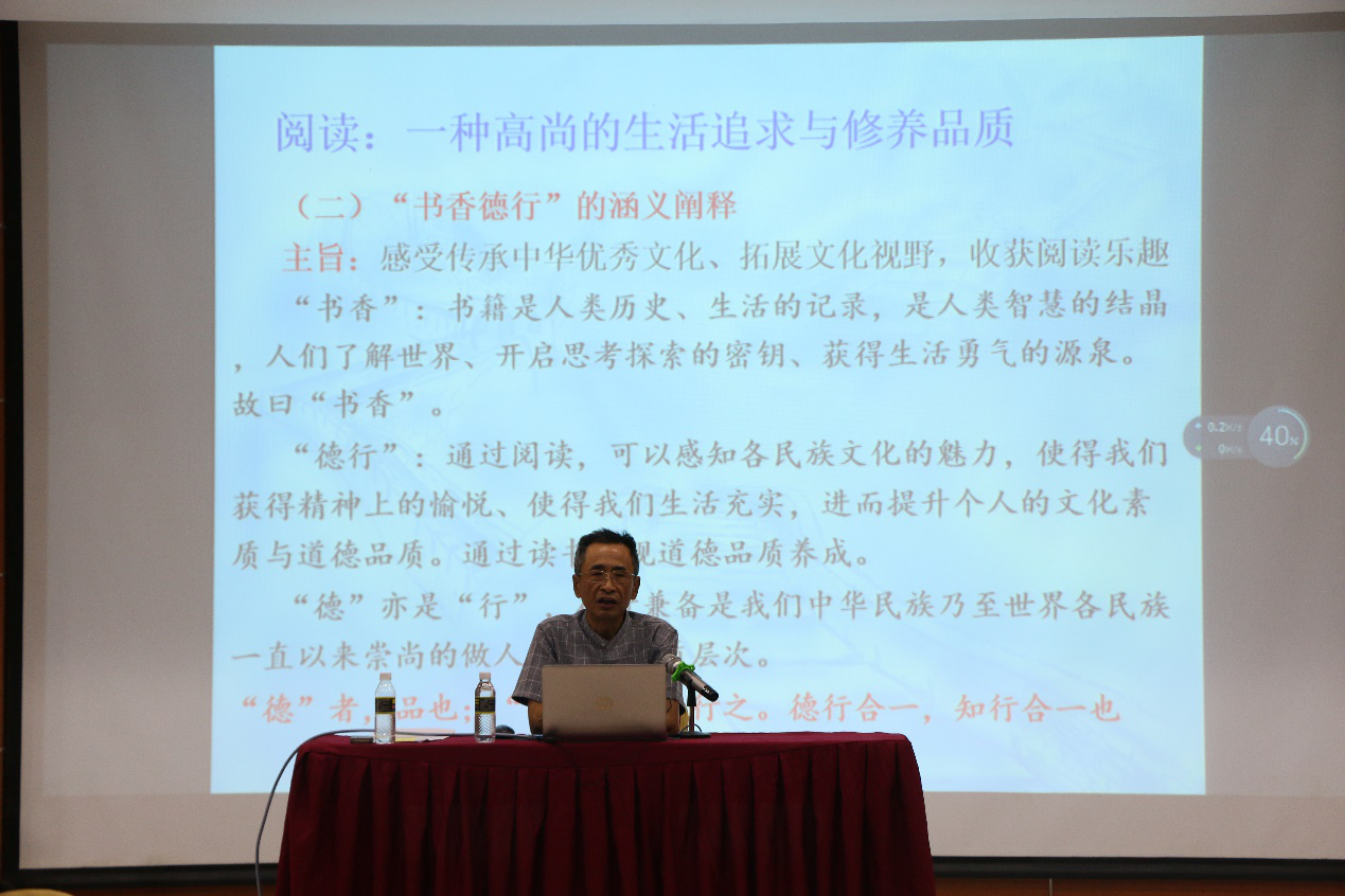 首先由崔昌华副书记上台讲话,开始启动“读懂中国”教育主题活动。接着是周国耀教授给我们介绍“书香德行”活动内容,阅读是一种高尚的生活追求与修养品质,感受传承中华优秀的文化,拓展文化视野,收获阅读的乐趣。对“书香德行”的涵义阐释。对为什么要提倡全民读书的问题,做出了详细的原因分析。最后,周教授为我们推荐了中国文化史类书籍。