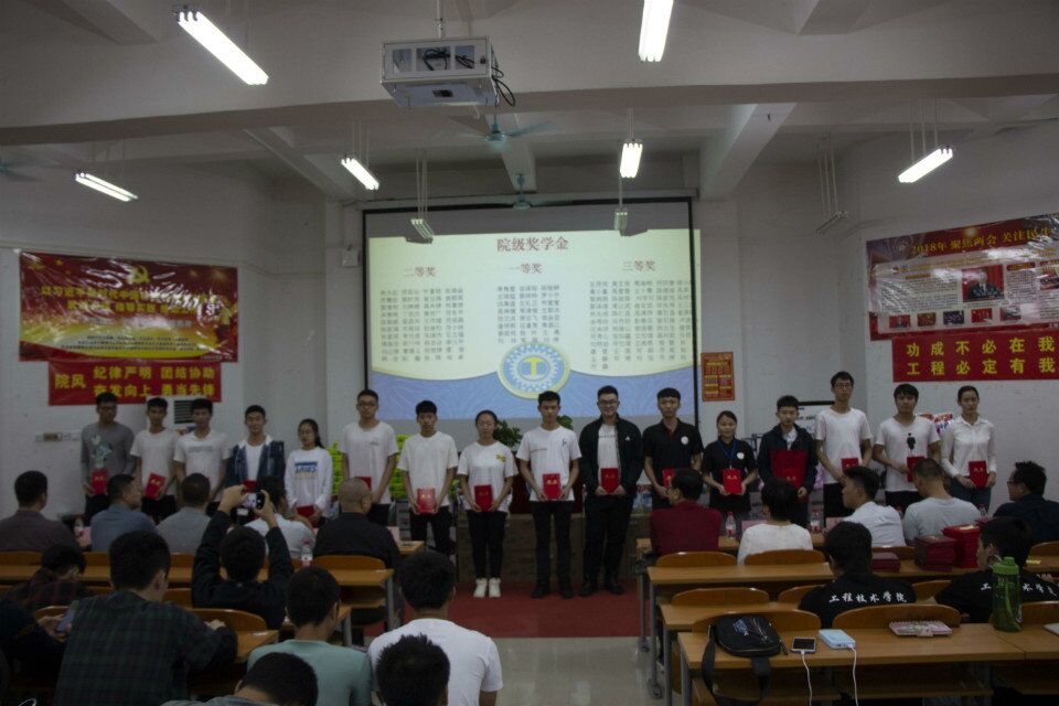 12月23日晚7时,工程技术学院全体师生在第二教学楼408教室隆重举行了一场别开声面的——“携手走进新时代,齐心协力谱新篇”为主题的2018年年终表彰大会。本次表彰大会颁奖内容齐全,种类繁多,涵盖了学生学习生活的各个方面。表彰大会现场铺设了红地毯,充满了节日的喜庆味道,颁奖现场场内场外坐或站满了整个会场,近500名师生参会。表彰会上,全体师生声音洪亮、集体诵读了学生管理愿景:“纪律严明,团结协助,奋发向上,勇当先锋”。整个颁奖会场场面隆重、气氛热烈、奖品众多,吸引眼球。大会由周恺老师主持。