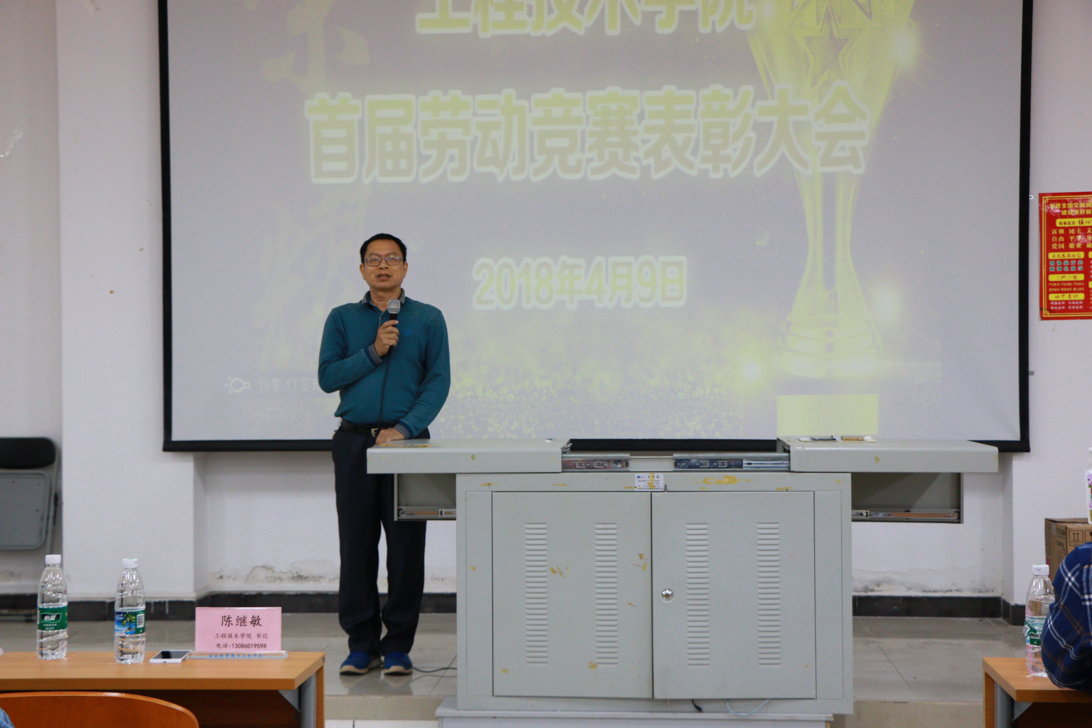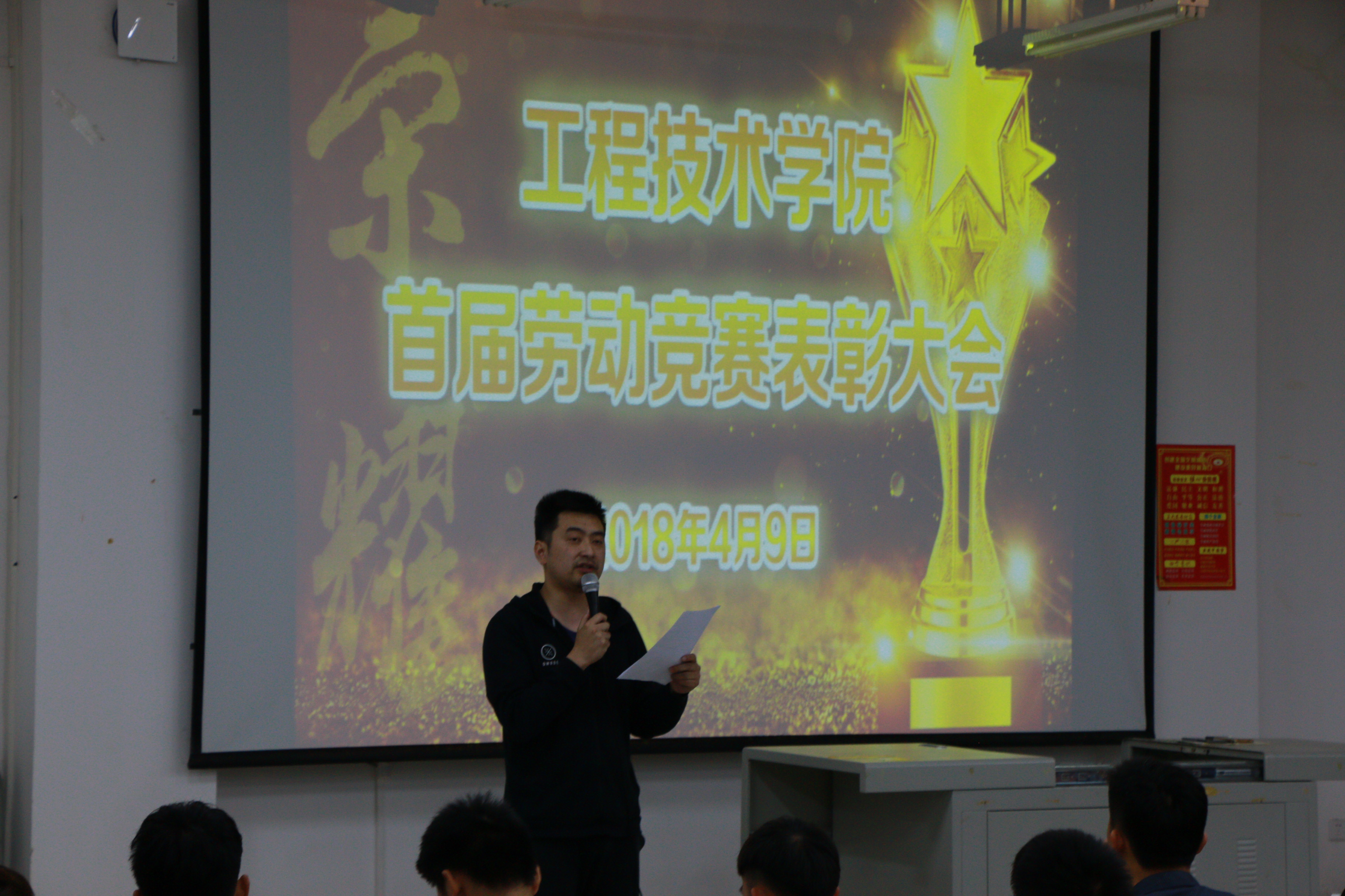 为激发同学们的劳动热情,增强班级凝聚力,2018年4月9日晚19时,工程技术学院在2教408教室召开首届劳动竞赛表彰大会,工程技术学院党总支书记陈继敏、副书记陈亚芳、学工办主任梁其钰与各辅导员出席,全体2017级新生参加,辅导员周恺主持会议。