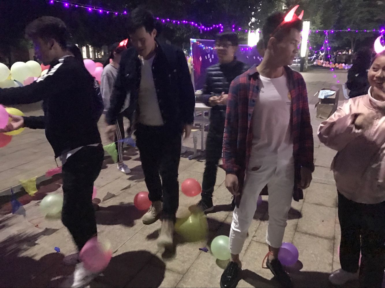 下午两点半,全体团学青成员已经聚集在活动地点,大家秩序井然地签到后,便回到自己的工作岗位上积极动手准备游园会需要的物资,并布置场地。今年的元旦游园会以趣味性、游艺性的综合模式展示,此次活动共分为6个活动项目,分别是猜字谜赢对联、套圈赢礼物、吹乒乓球、绑脚踩气球、竹竿舞和现场K歌。