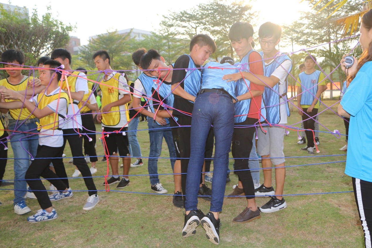 随着活动的进一步进行,各小组的势气高涨,各小组通过挑战不倒森林、珠行万里、弹球进框、信任背摔、过电网、感恩的心、风雨人生路等游戏来相互了解和帮助,本次活动大家都积极的参与其中,一个个有意义的小游戏在大家的默契、团结一心,队员们的相互帮助中一项项的突破挑战,同学们都沉浸在活动的乐趣中,沉浸在团结合作的氛围里,被不抛弃不放弃的氛围感染,虽有苦楚,却毫无怨言,虽有困难,依然迎难而上。