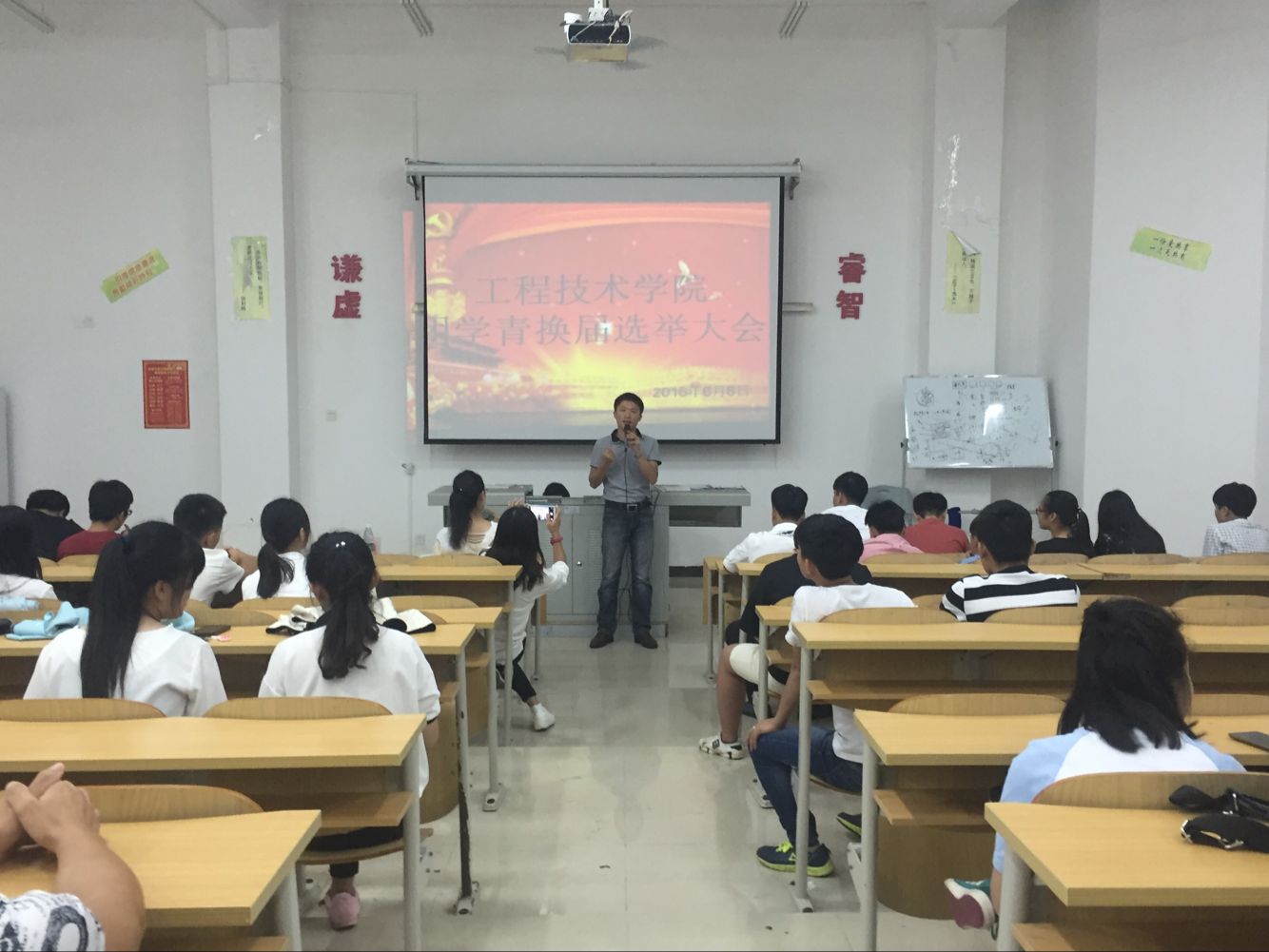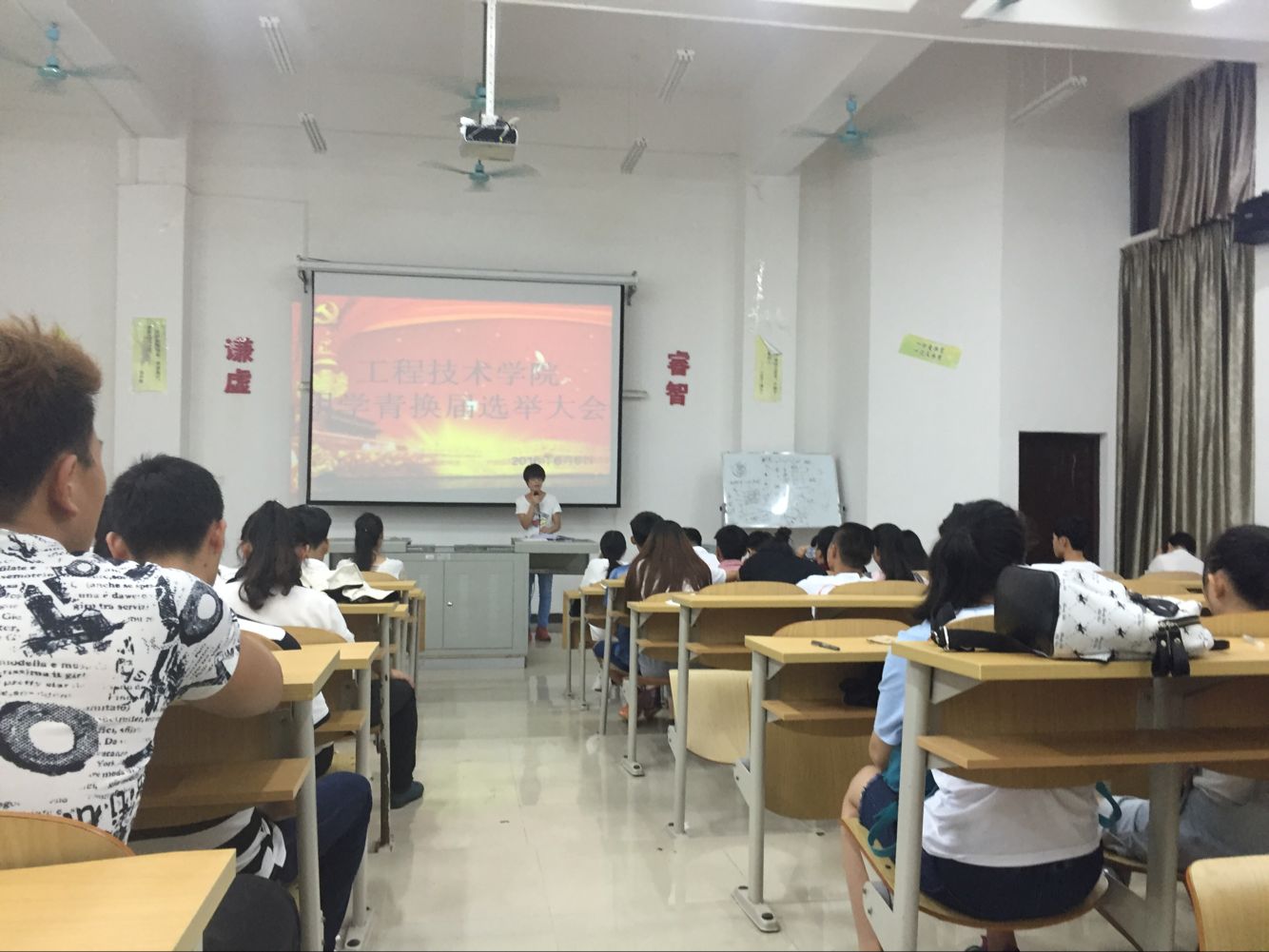 6月7日讯(工程技术学院 岳将红报道)又是一年毕业季,在学长学姐激情飞扬,拥抱挥帽的欢乐时刻,团总支学生会换届选举大会也在热烈上映。6月6日晚7点整,工程技术学院第一届团学青换届选举大会在2―526举行,出席本次大会的有院团总支书记梁其钰老师、院团学青负责人代晓明老师、院主席团成员以及全体团学青干事,大家共聚一堂,一起来迎接这神圣而又激动人心的时刻。
