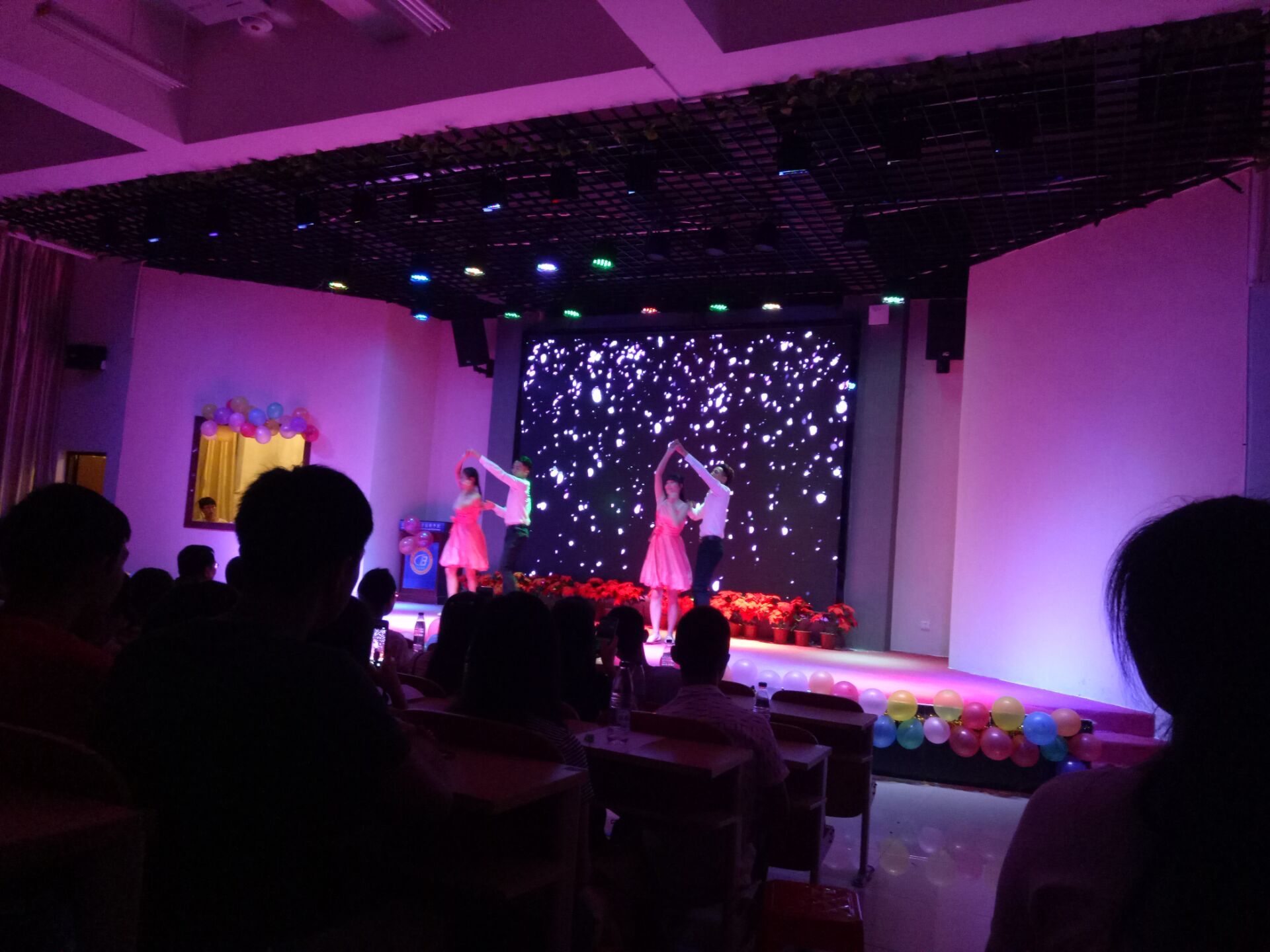 在悦耳的音乐声中,四位俊男美女作为主持人,宣布迎新晚会的正式开始。晚会开始,一段优雅的交谊舞将新生们的目光紧紧的吸引在了舞台上,舞者们动人的舞姿,自信的气质展现得淋漓尽致。随后的各种舞蹈,小品,歌曲,吉他弹唱等节目,也充分展示了新生的风采。