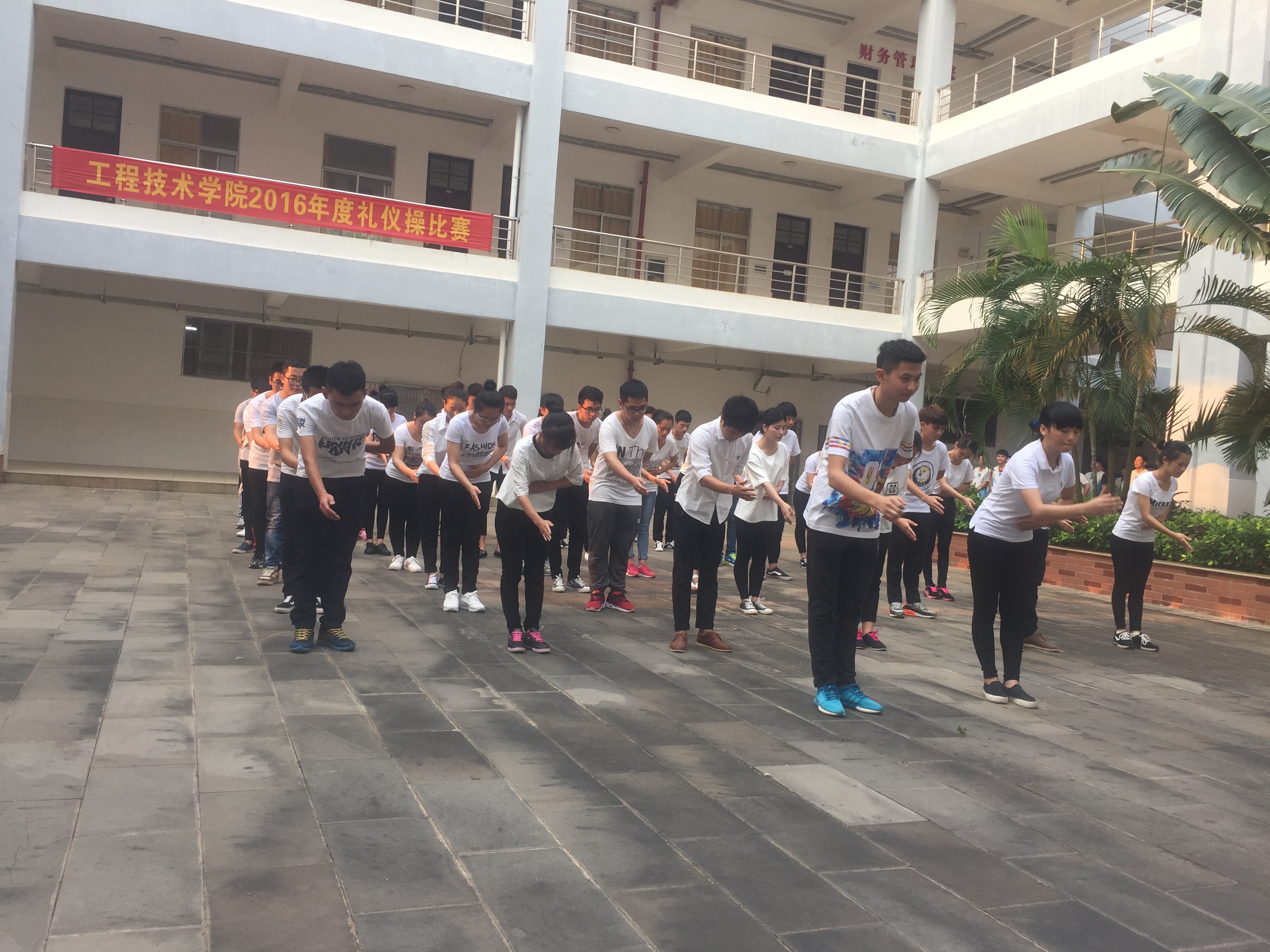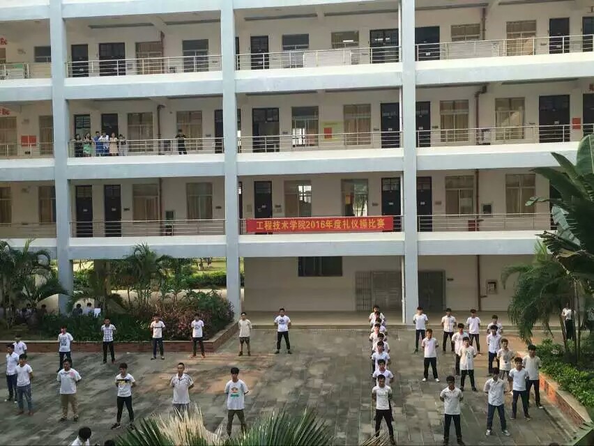 4月12日讯(工程技术学院 李京京报道)为培养学生文明、诚信、有礼貌的良好形象、弘扬礼仪风采,我院在4月12日下午5点整在第二教学楼下举行了工程技术学院2016年度第一届礼仪操比赛。本次比赛担任评委的有工程技术学院团总支书记梁其钰老师、15级辅导员肖洁老师、团学青主席赵丽、副主席叶绵海、副书记朱振通、副秘书长李京京。比赛在主持人容世超的开幕词下拉开了帷幕。