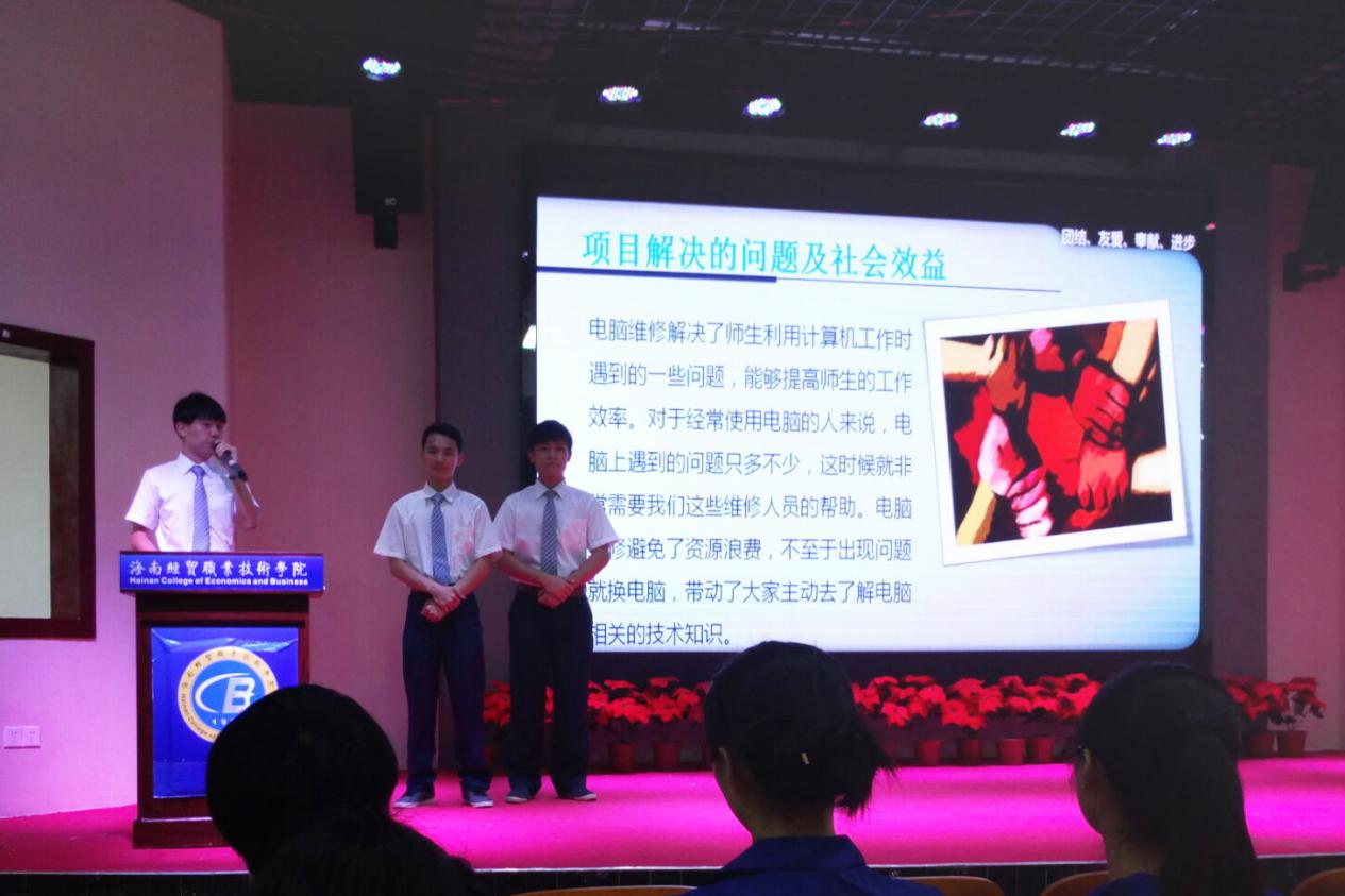 赛场上六个学院的九个志愿项目在舞台上一一展示并介绍给现场观众,我院的代表项目“校园微公益·电脑嗨不止”主要是结合现在的网络社会特点,充分利用专业优势,不定期组织电脑义诊的活动,帮助大家解决生活中遇到的电脑问题。最后经过评委们的综合测评,我院的代表项目获得了志愿项目一等奖,并要求我院志愿团队代表学校参加海南省志愿服务项目大赛!