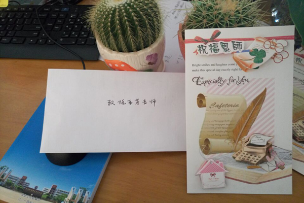 9月10日清晨,由我院学生会主席魏锴和副主席黄丹负责教师节活动的开展。其中,由我院13、14级各班代表给我院全体教师送去了短信祝福,感谢辛勤工作的园丁们对我们默默地付出与无私的奉献;其次由各班同学写下最美的文字以贺卡的形式递送给老师,来表达对老师的敬爱之情;另外再给每位老师送去仙人球,仙人球代表老师的耐力、坚强、旺盛的生命力,不屈服的个性。通过这一系列的形式表达对老师无限的爱意、真心的祝福和由衷的感谢。