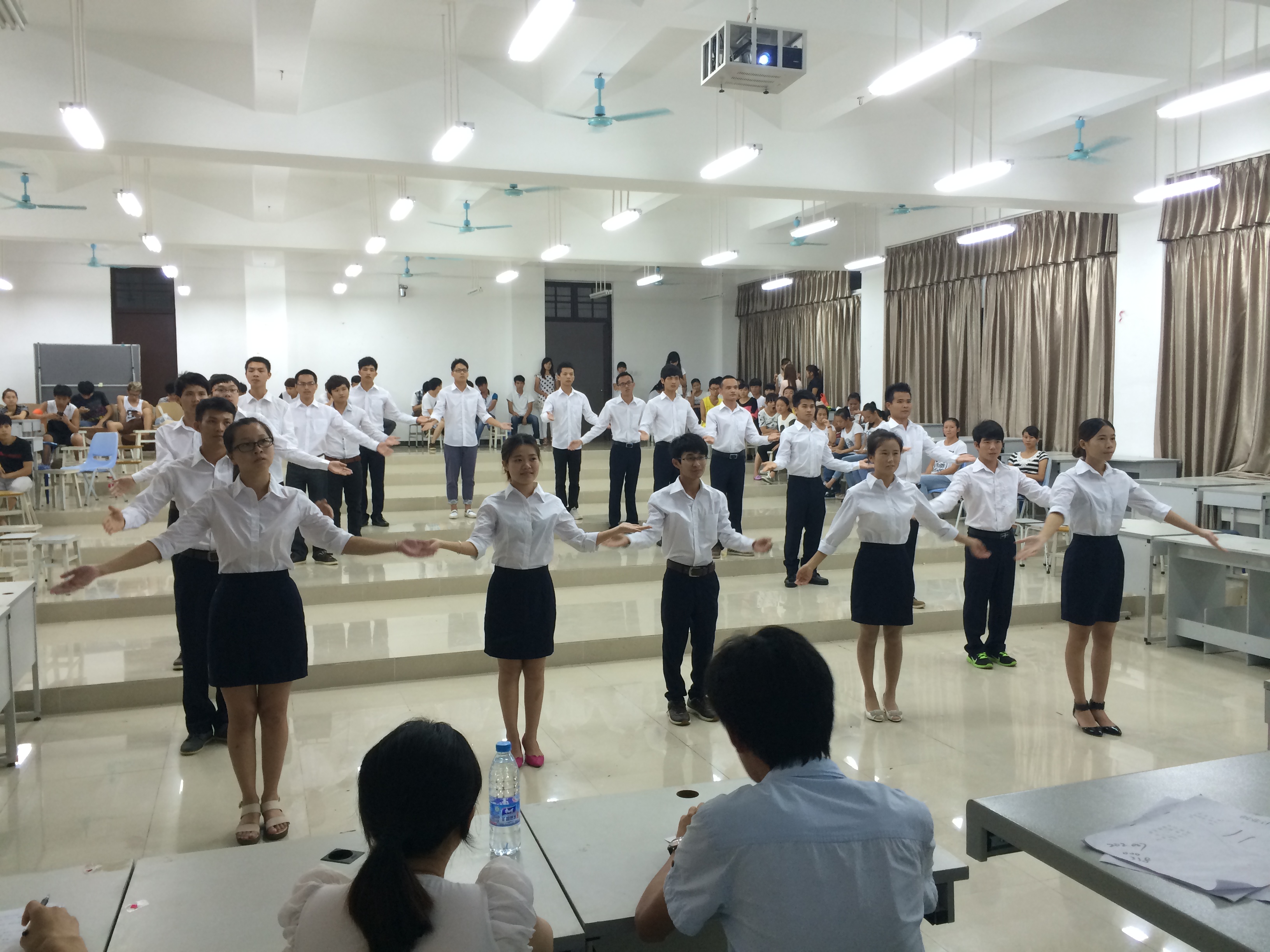 12级辅导员陈青云老师、13级辅导员龙导老师、团总支学生会秘书长钟超作为特邀嘉宾观看了本次比赛。由本系13级各个班级组成的4支参赛团体依次登台献艺,各班参赛队伍的手语操共同以励志向上的歌曲《相亲相爱一家人》为音乐背景,将感情与意境相融合、肢体语言与心理情感相协调,共同诠释歌曲的主题思想。大赛过程中,气氛浓烈,高潮迭起,参赛选手把台上和台下都化为了他们的演出舞台,整齐的动作,多样的表演元素,赢得了在座老师和学生的阵阵掌声。