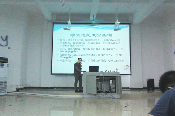 本系9月13日讯(信息技术系 丁燕琴报道)9月12日晚7:30,为使新生们走好大学生活关键的每一步,14级新生辅导员龙腾老师(以下简称“龙导”)在2-408教室开展了新生教育工作,其中由14级所有新生以及各班代理班主任参加了此次讲坛。