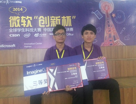 本系4月11日讯(公共计算机教研室马红报道)在4月9日至4月11日在举行的微软“创新杯”全球学生科技大赛中国海南赛区决赛中,我系“HCEB-汉字书写”作品在决赛中取得三等奖。
