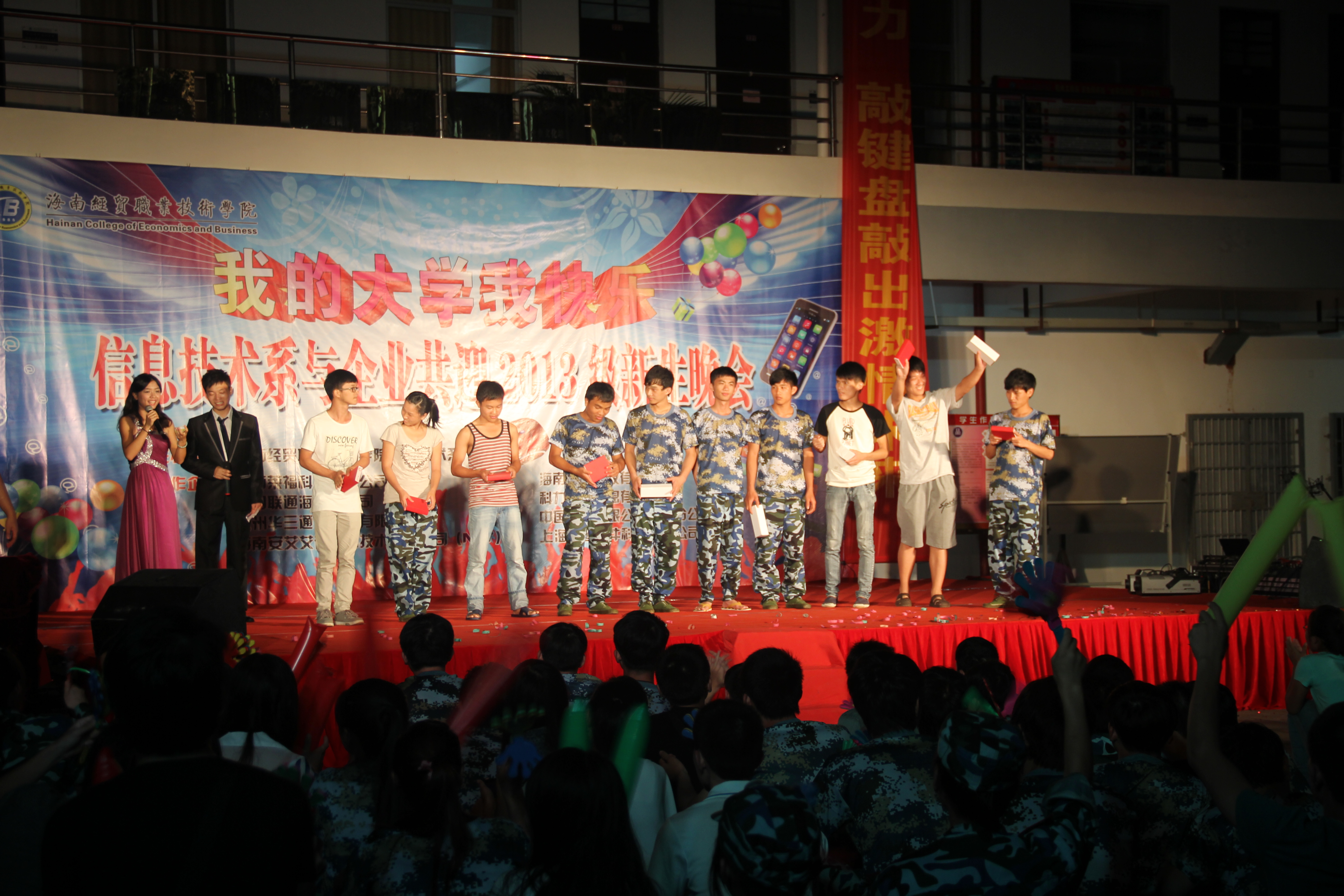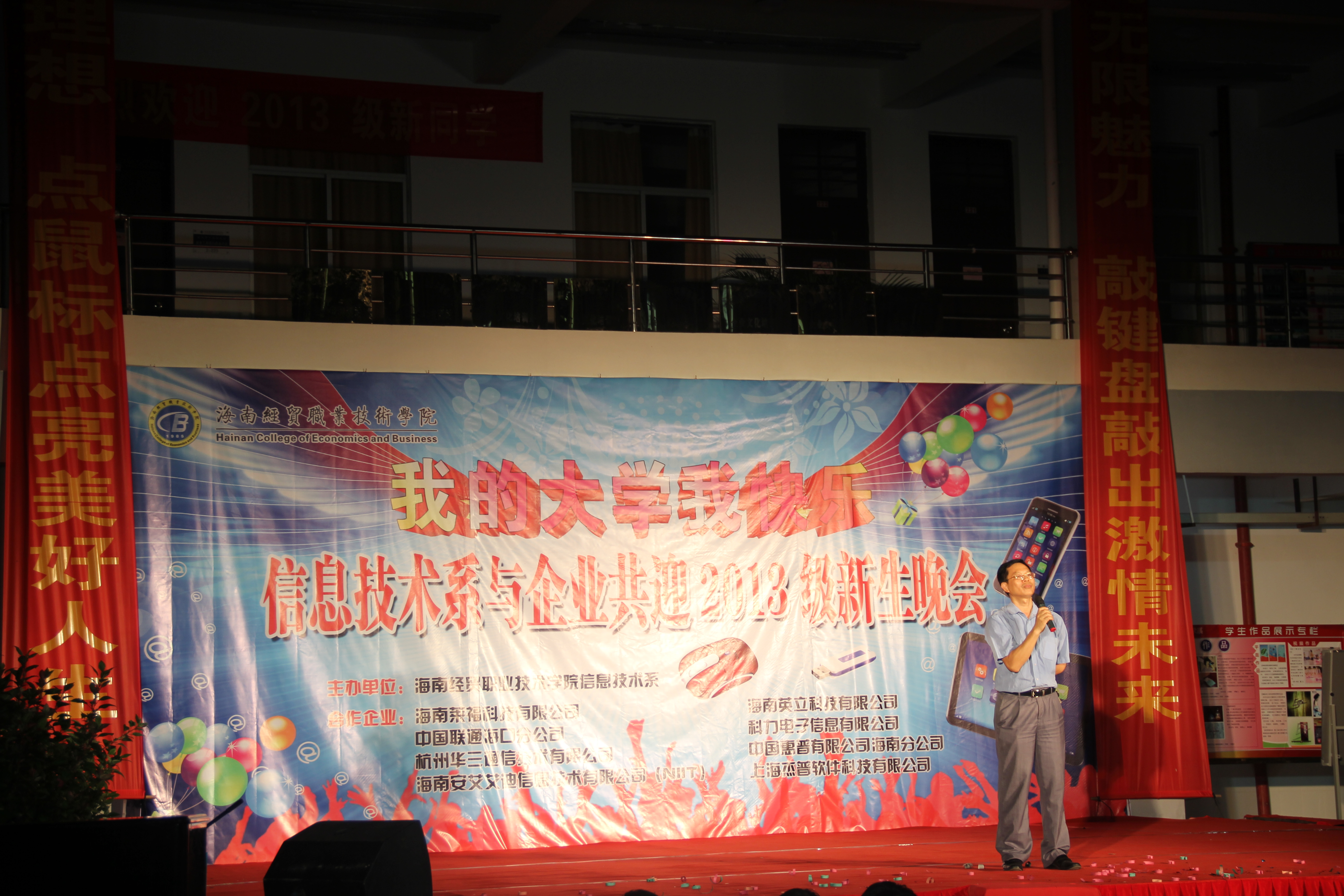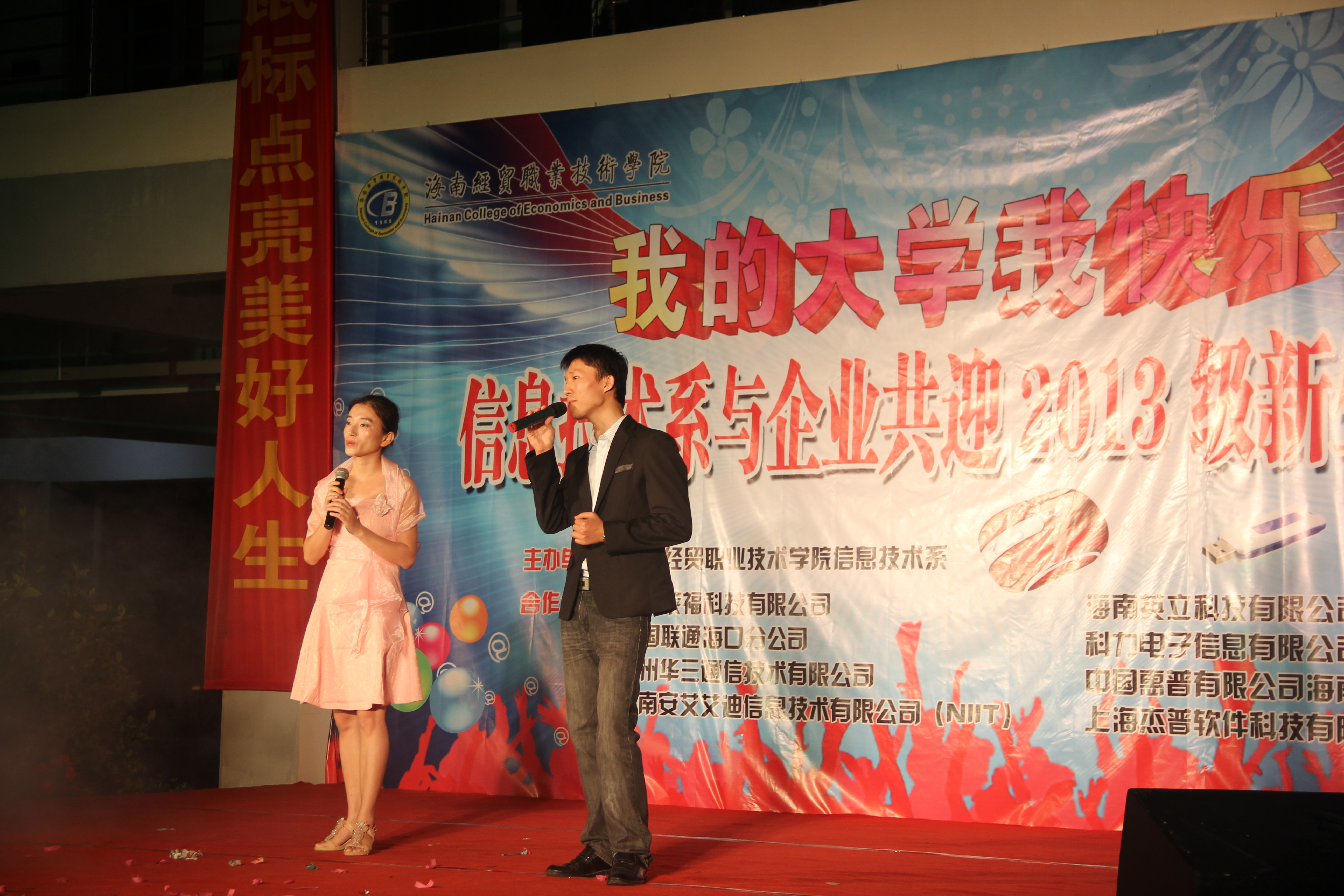 (信息技术系宣教部报道)9月27日晚8点整,信息技术系在二栋教学楼楼下以“我的大学我快乐”为主题举办信息技术系与企业共迎2013级新生晚会,特约嘉宾有:我系党总支书记陈继敏,系主任李丽蓉,系副主任王凡帆、计算机网络技术专业负责人王岩、电子商务专业负责人单继周、计算机多媒体技术专业负责人李兵、学生党支部书记陈亚芳、辅导员陈青云、龙腾老师,另外还有我系各个专业的老师出席晚会现场。出席本次迎新晚会的企业有中国联通海南分公司、杭州华三科技有限公司、海南安艾艾迪有限公司、海南莱福科技公司、海南英立科技有限公司。