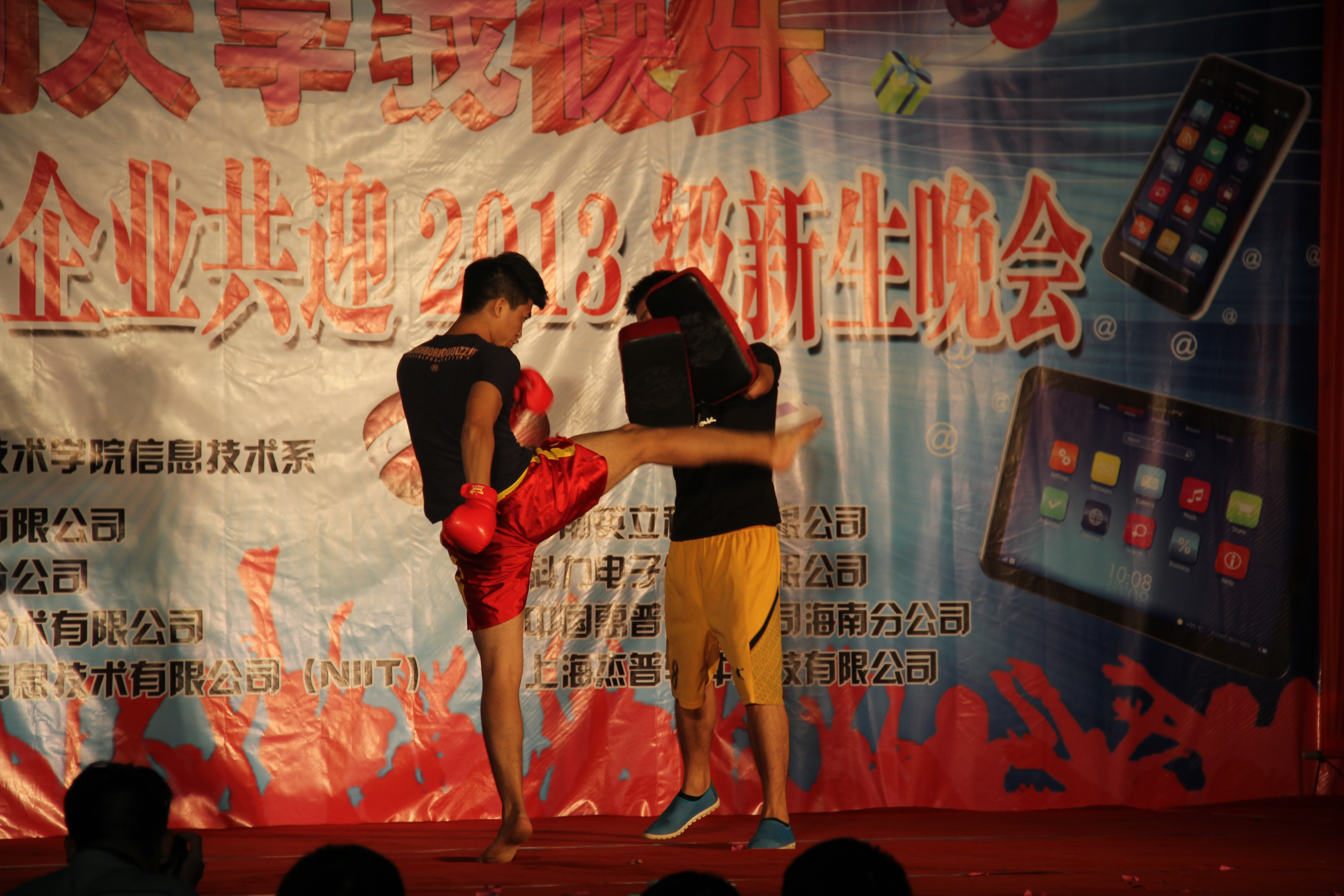 在一阵动感十足的音乐过后,晚会第一拨高潮开始了——散打表演,一个完全由12级网络2班卢玉俊自己创新的节目,一个展现自己的节目,一个秀出自己的节目.看台上,灯光迷离;观台下,群起欢呼,一位位观众变成欢乐的精灵.演员们脱下了学生装,换上了散打服,打着硬而有力的散打,用自己特有的形体语言解释生活,今天的你们才是其中的主角,今夜让欢乐与激情在活动中心成为永恒的主题……