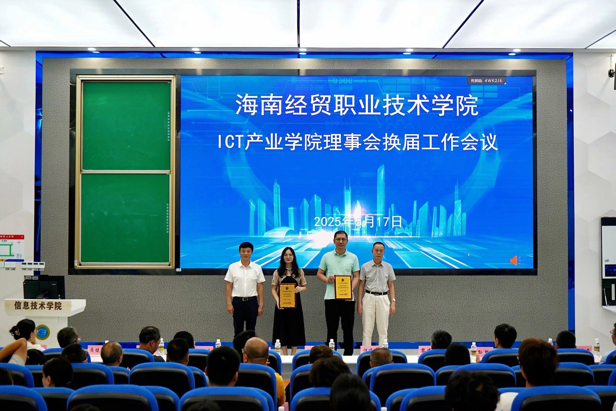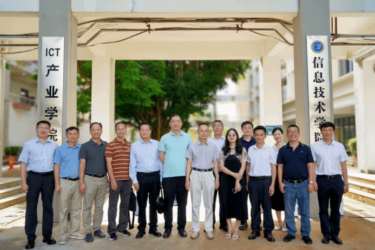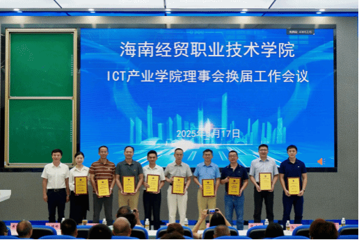 会议结束后,全体与会人员前往产业学院一楼合影留念,为本次重要会议画上了圆满句号。此次ICT产业学院理事会换届工作会议的成功举办,对于提升学院办学水平、完善治理结构、促进ICT产业人才培养具有重要意义。未来,ICT产业学院将在新一届理事会的引领下,充分发挥各方优势,不断探索创新,为海南地区ICT产业的发展注入新的活力,培养更多适应行业需求的高素质技能人才。