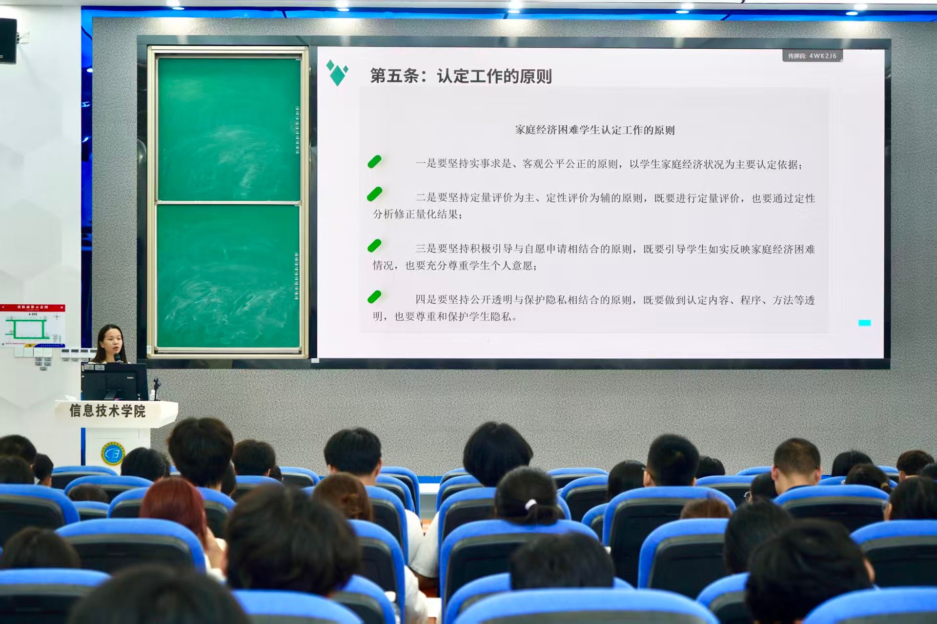 针对新生可能存在的政策疑惑,王智娴老师特别指出,认定工作坚持“实事求是、公平公正”原则,只需如实填报申请表并附上相关佐证材料。她还介绍了学院奖助学金、助学贷款等资助项目的申请节点与材料要求,鼓励符合条件的新生主动申请,并强调诚信申报的重要性,提醒新生若家庭经济状况发生变化需及时与学院沟通。