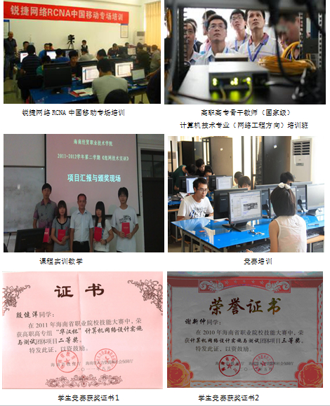 利用该实训室为企业员工、教师及社会人员开展网络技术专业技能培训,如利用实训室开展中国移动职员专场培训班、高职高专骨干教师(国家级)培训班等。