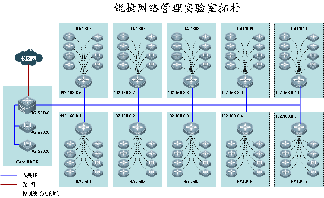 3.设备配置:实训室由61台"联想"PC机,1台"浪潮"服务器,10组"锐捷"网络管理实验实训设备:网管型交换机、路由器、防火墙、入侵检测系统、融合通信和协议分析等网络设备构成。